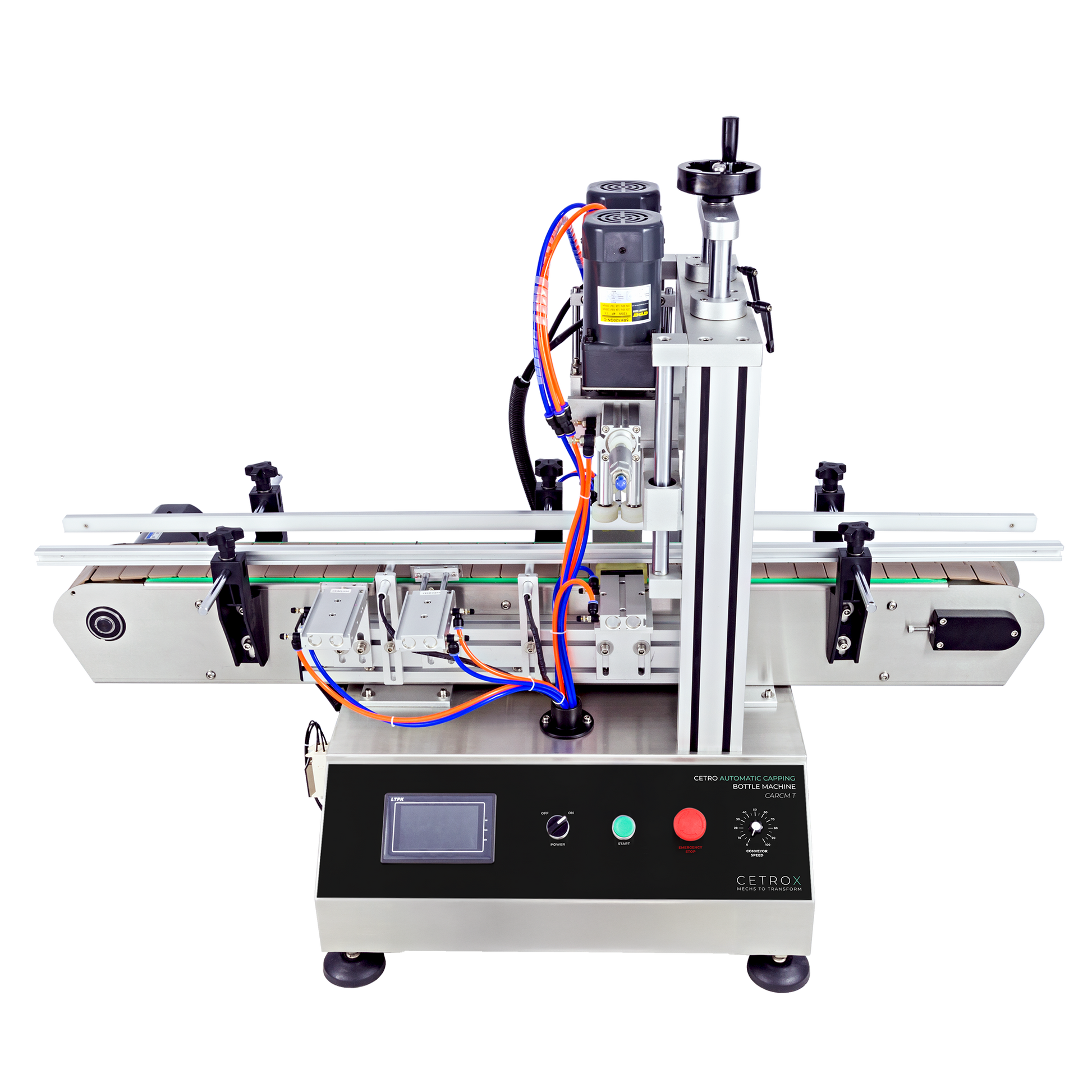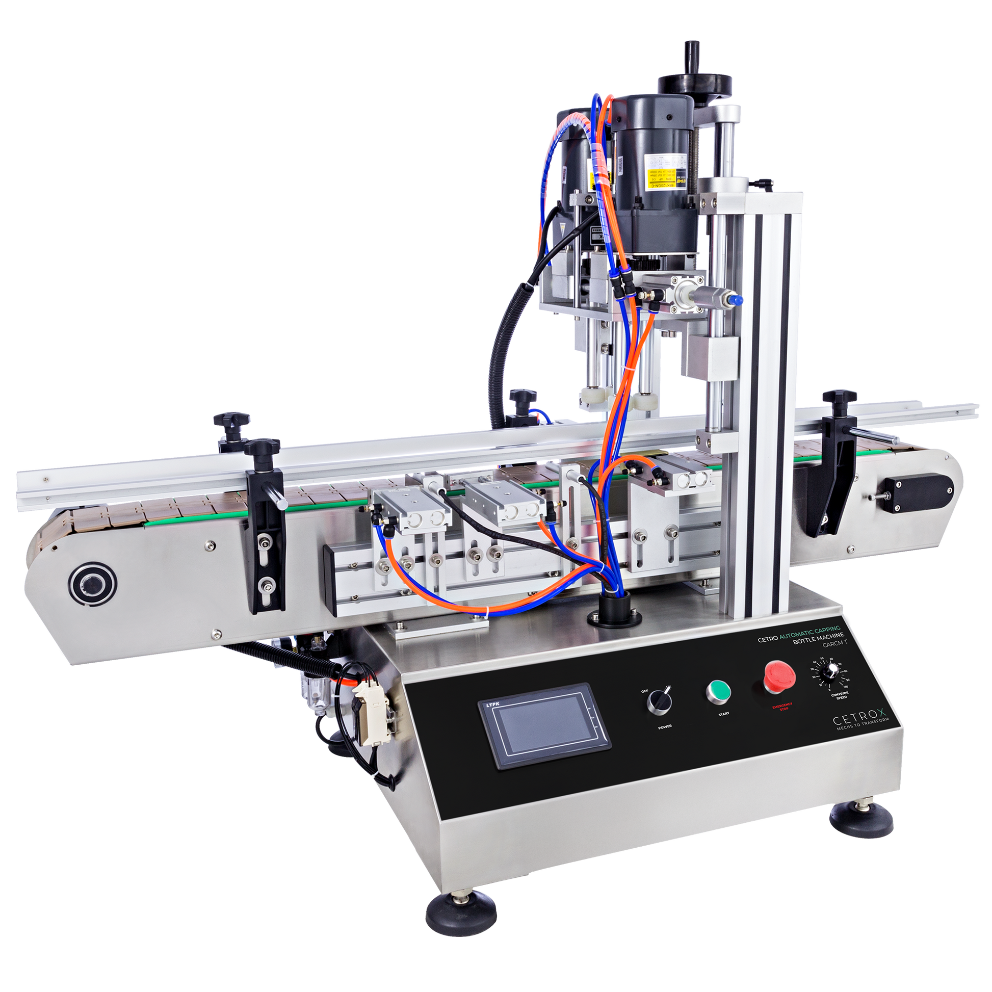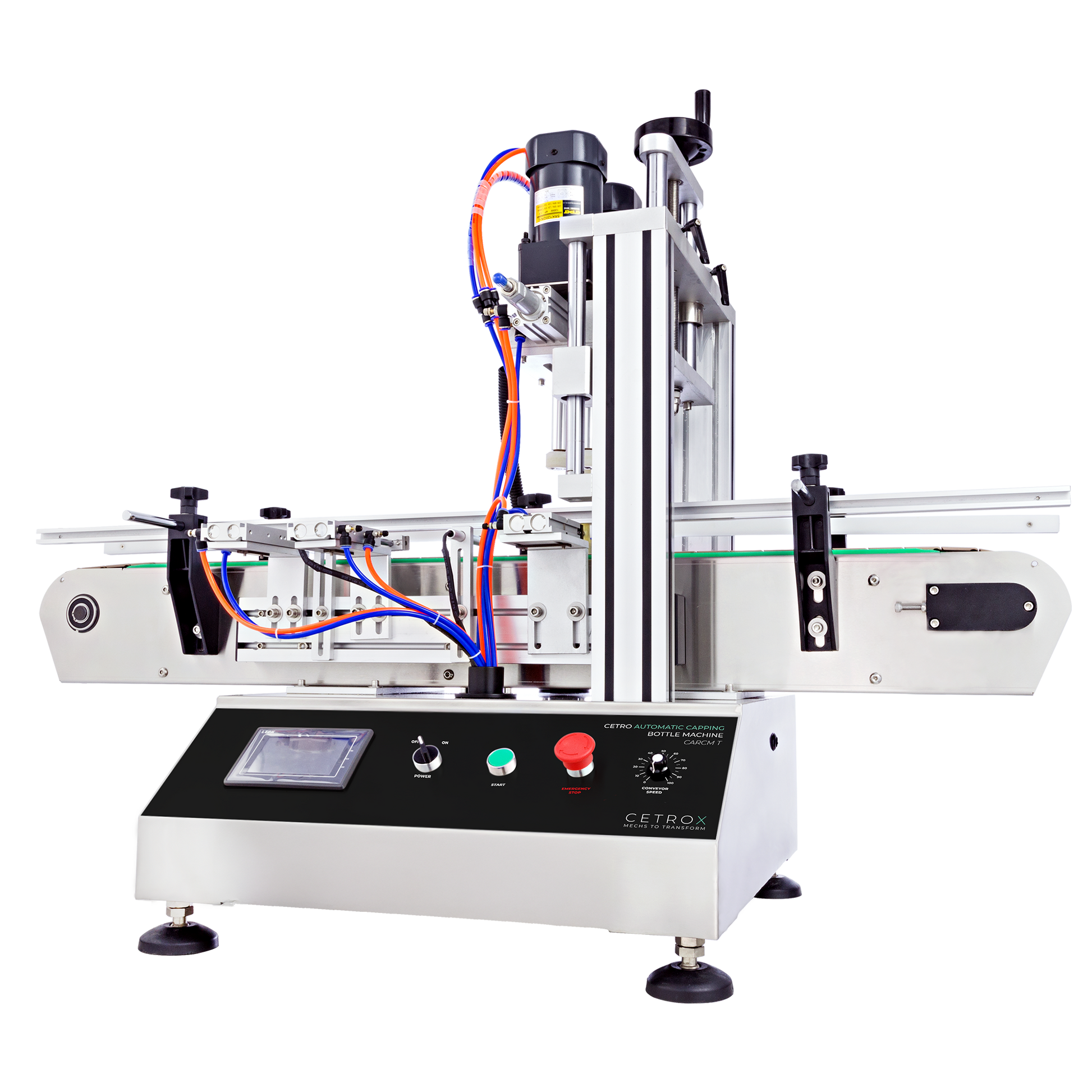 Cetro Automatic Capping Machine CARCM T has a programmable conveyor belt with speed and width adjustment according to the bottle, which allows a high-technological and accurate process and the agility and optimization of the production line.