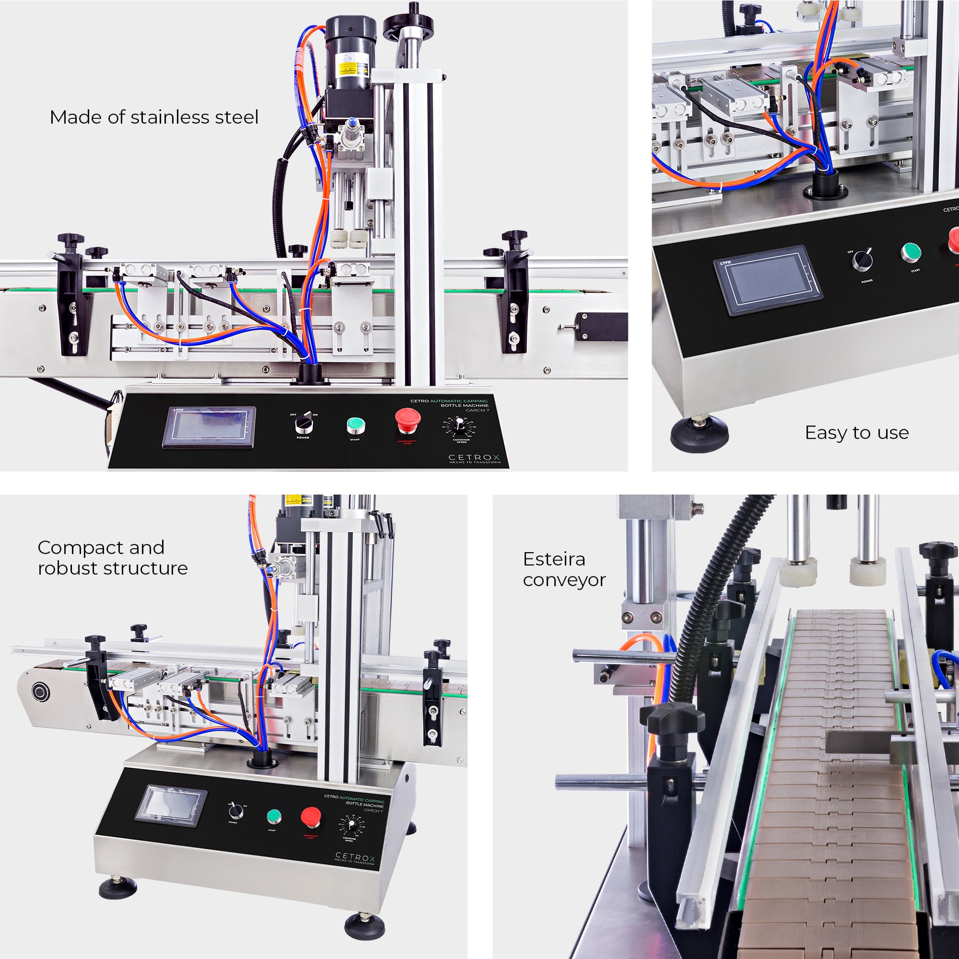 Cetro Automatic Capping Machine CARCM T is robust and compact and has pneumatic components that block the contact of the product with the external environment during the capping, so it does not lose natural characteristics, such as flavor and texture, or suffer from the action of time. Thus, this equipment performs a hygienic and safe process.