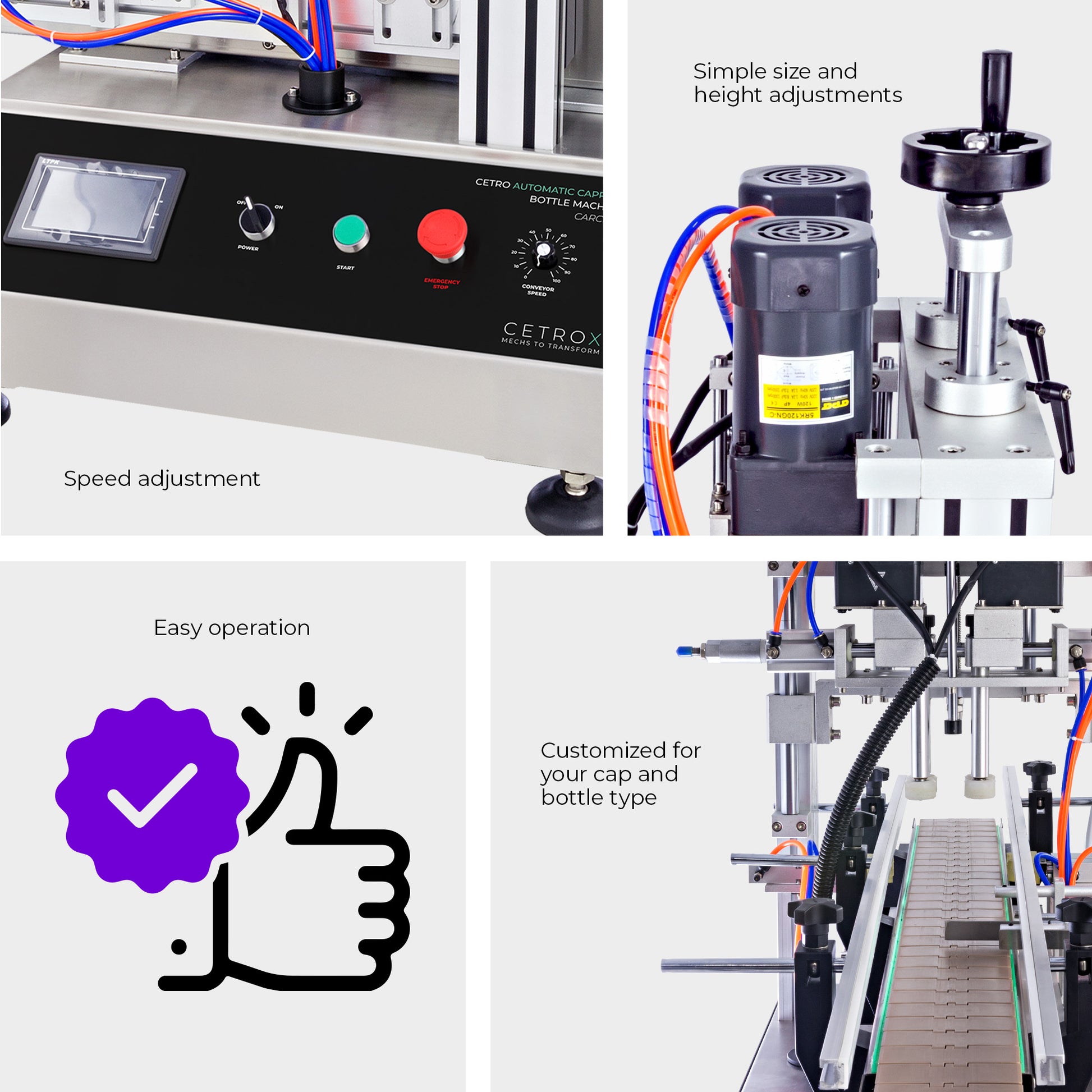 This equipment can be adjusted for bottles with a diameter between 1.6 - 3.9 inches, height between 3.1 - 8.3 inches, and caps of 0.79 - 2 inches to guarantee the necessary torque to make the packaging tamper-proof.