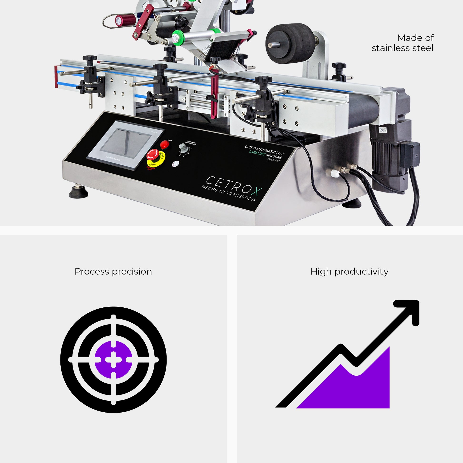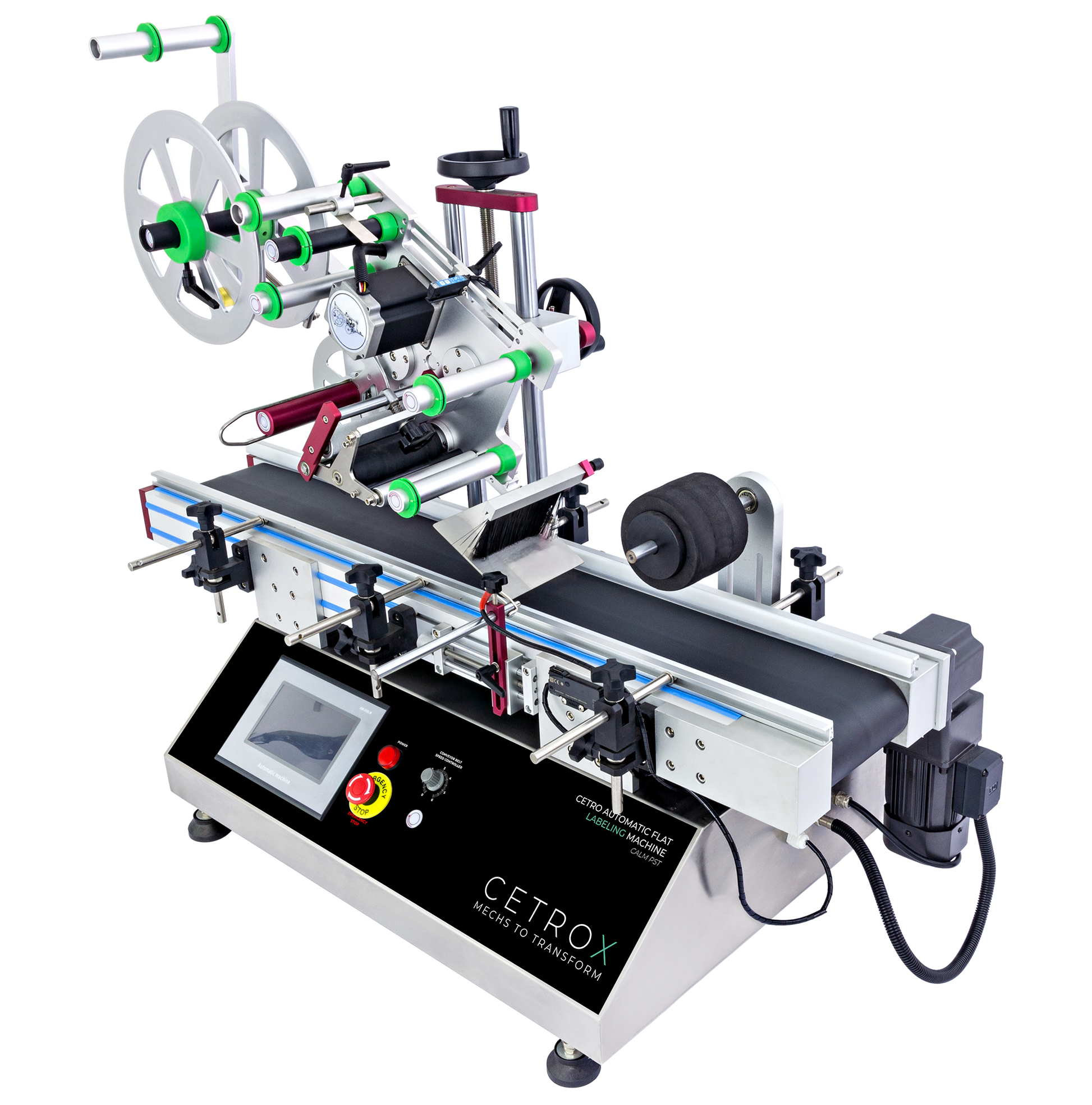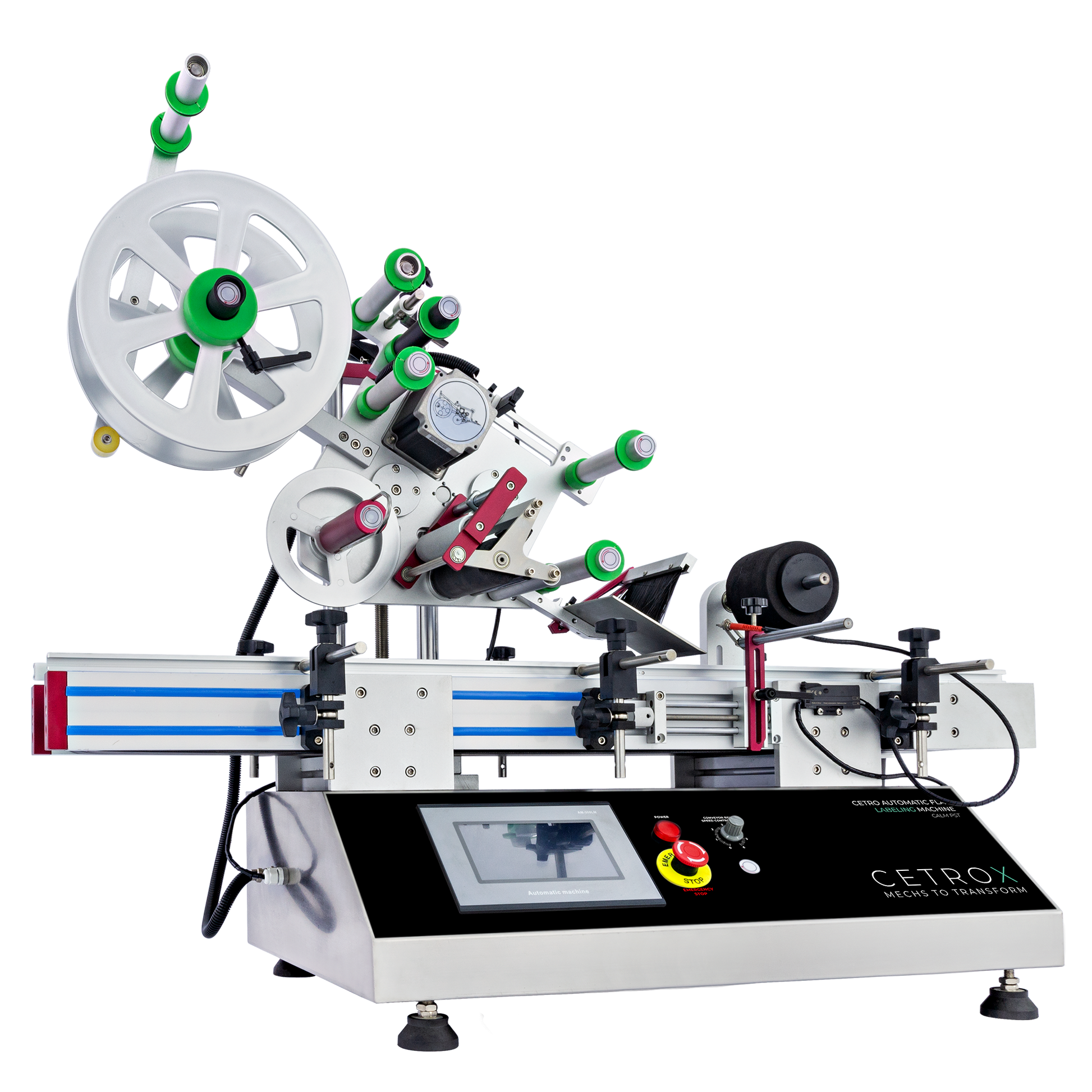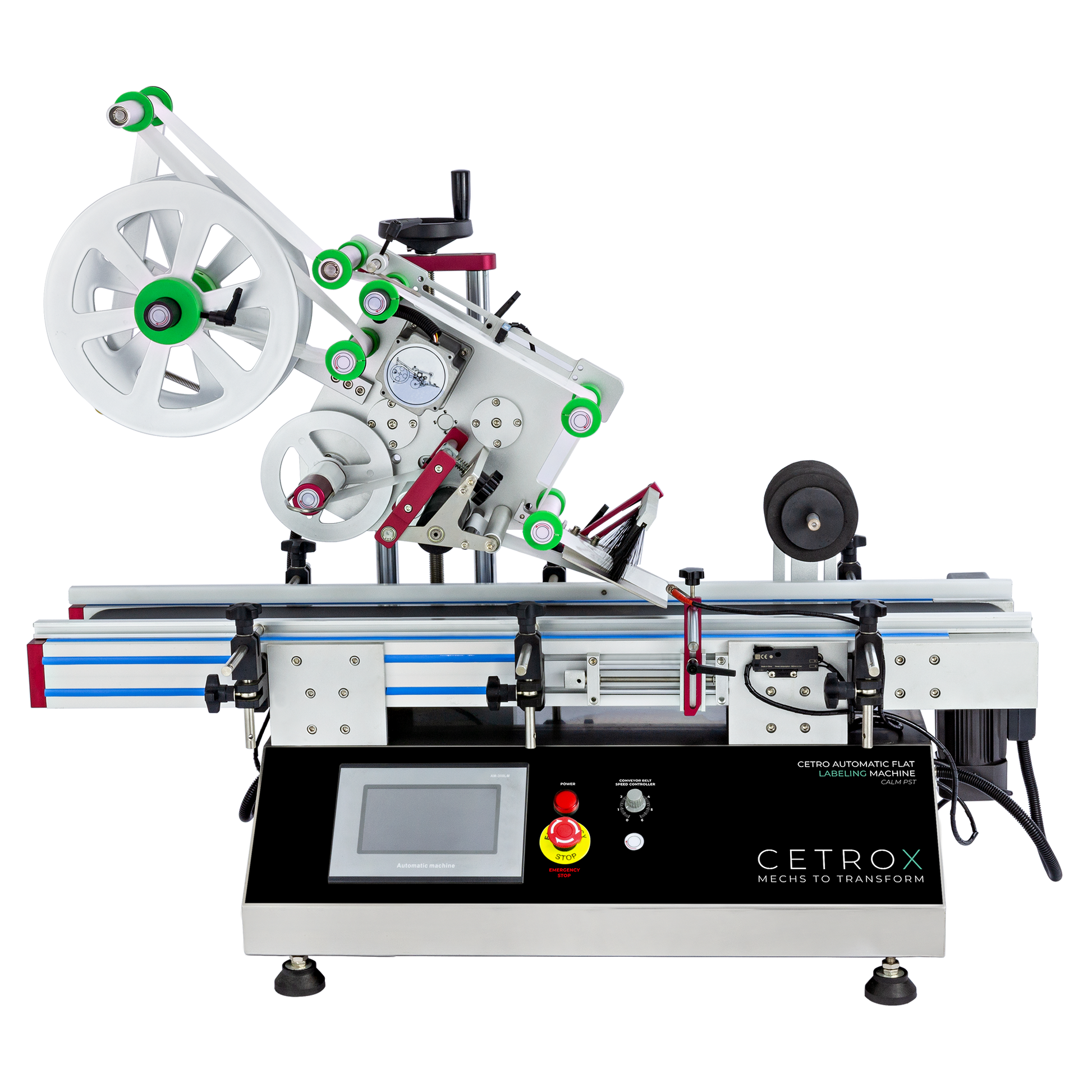 Cetro Automatic Labeling Machine CALM PST can label flat surfaces of products such as cardboard, lids, flat packaging, paper, and various other items in various market sectors, such as food, chemicals, pharmaceuticals, hospitals, cosmetics, and others.