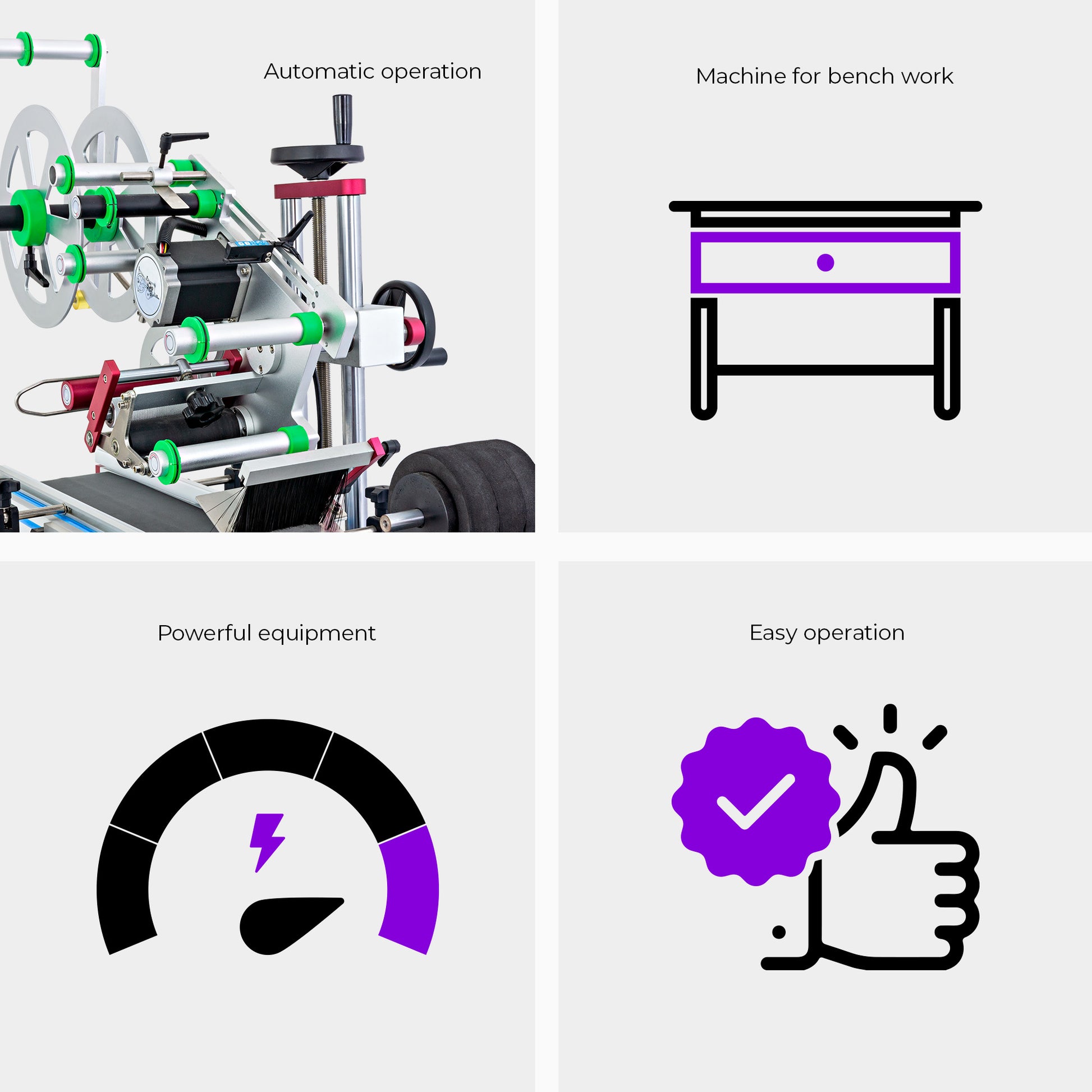 This model is labeled with speed and accuracy, allowing the operator to monitor the process via their control panel. The labeling process is automatic, practical, and controlled, reaching up to 150 surfaces per minute.