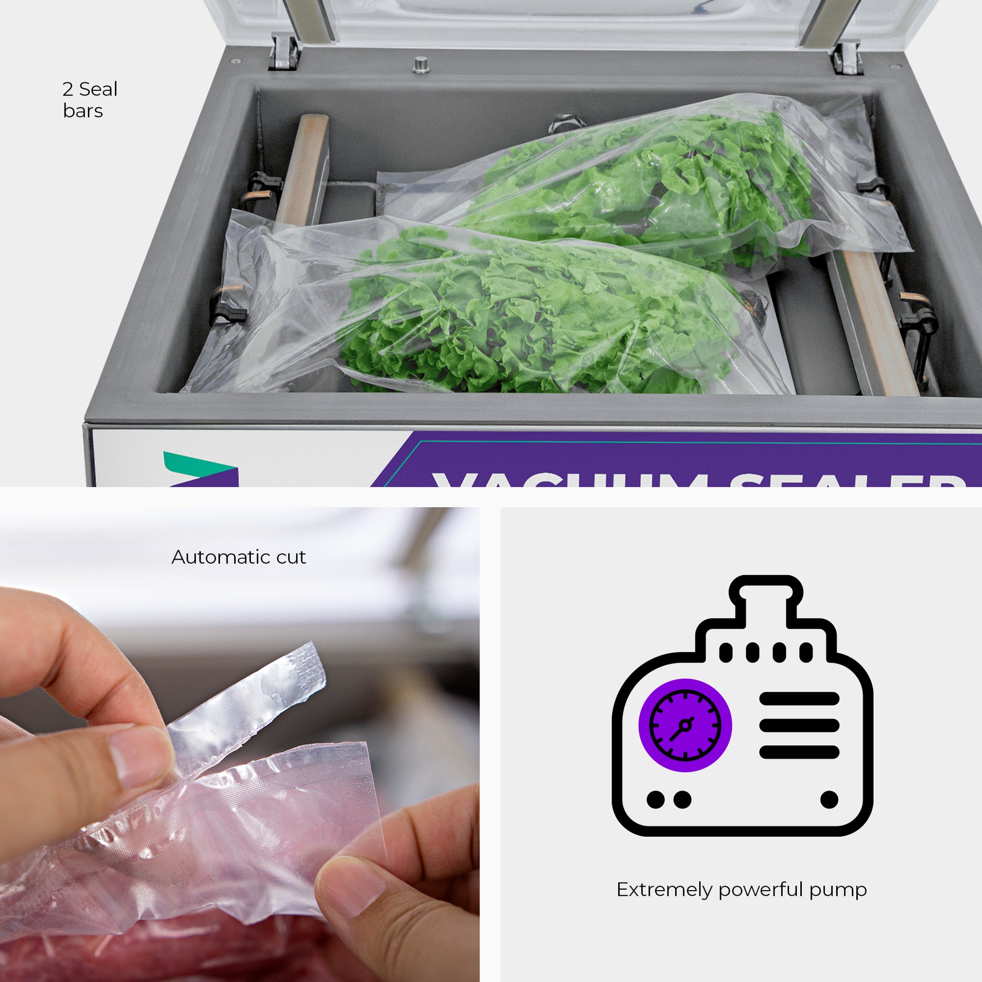 It is an efficient machine with settings for sealing time and temperature and vacuum time. It has a powerful vacuum pump and a thick acrylic lid. Besides, it features two heat-sealing bars of 16 inches each and automatic cut of the material excess. This combination of settings makes the CCVS 400 T precisely suitable for various products and vacuum bag sizes.