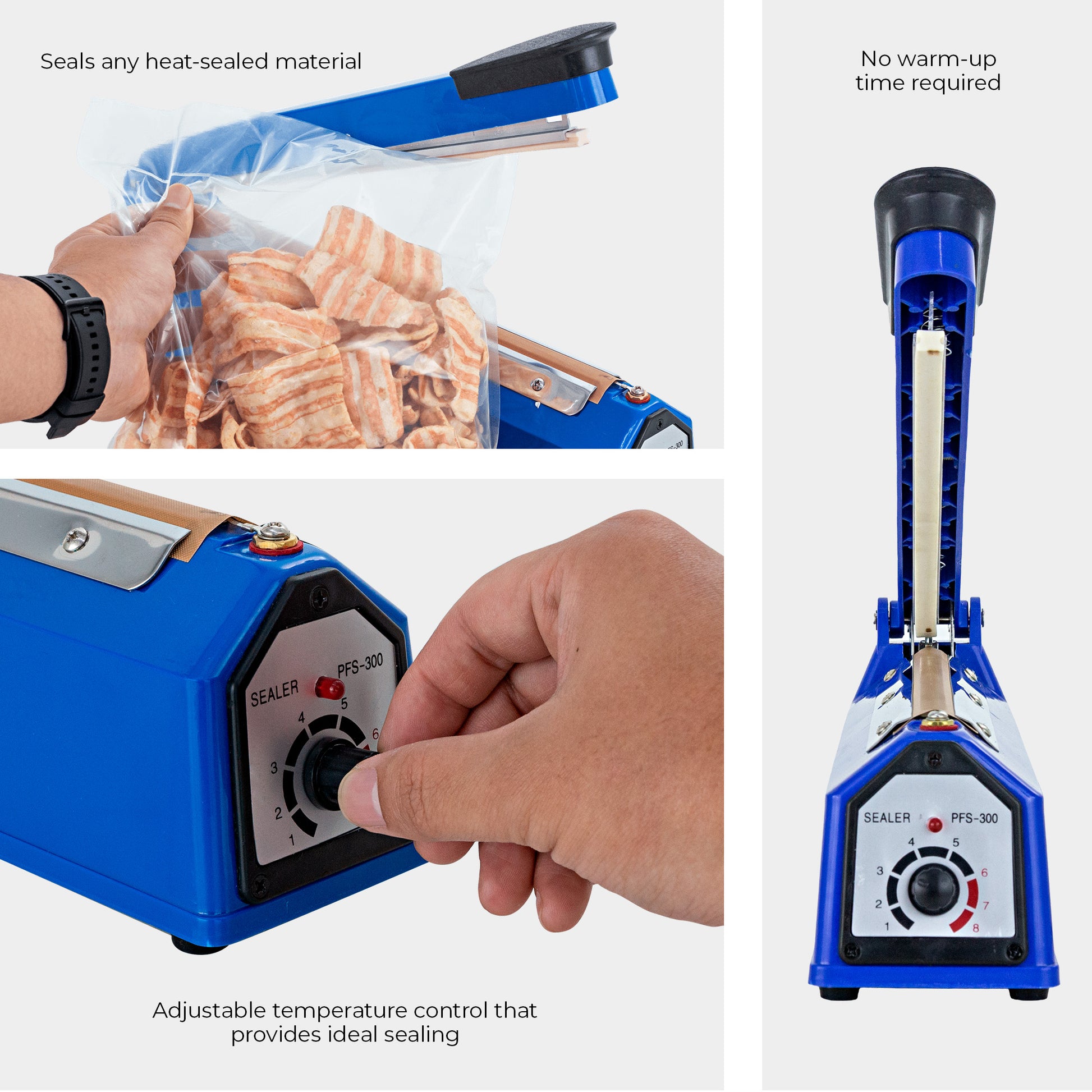 Its heat-sealing bar can seal plastics up to 12 inches wide and uses a blade-type resistance system, which allows a perfect seal and keeps the sealed products preserved for longer.