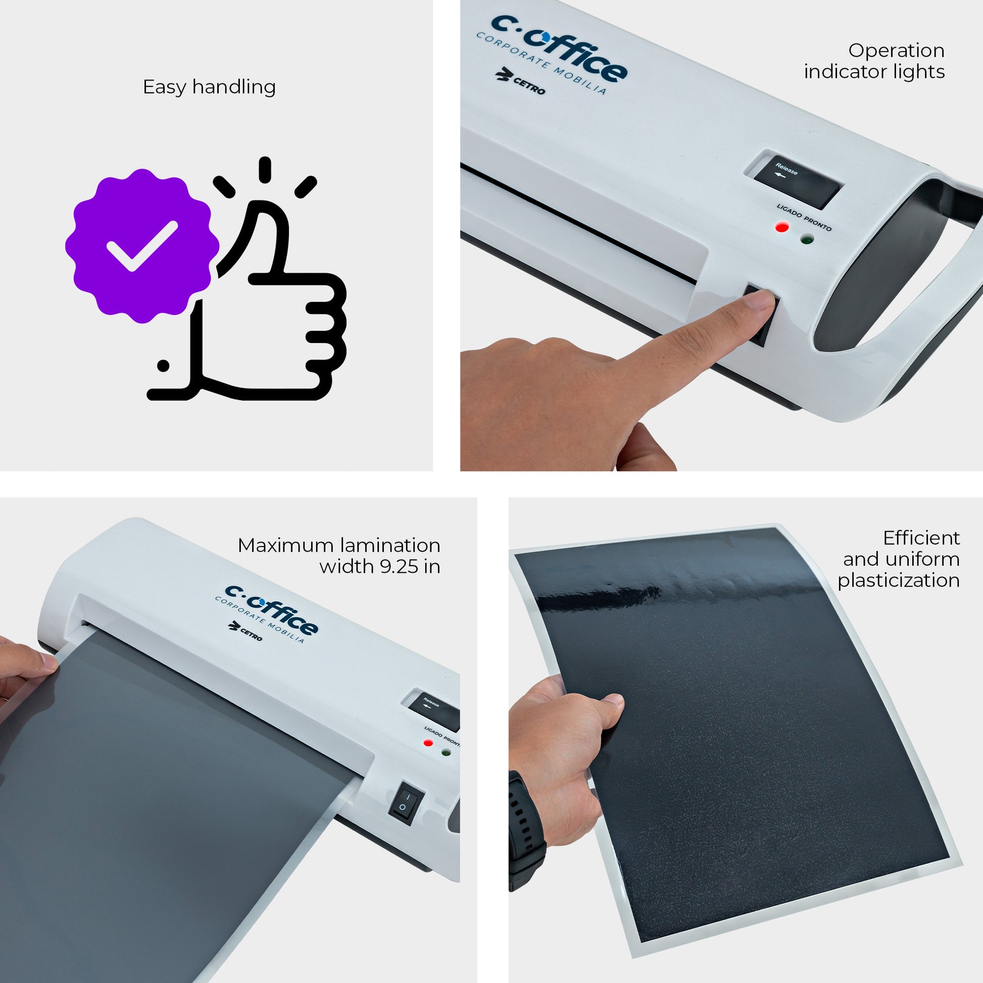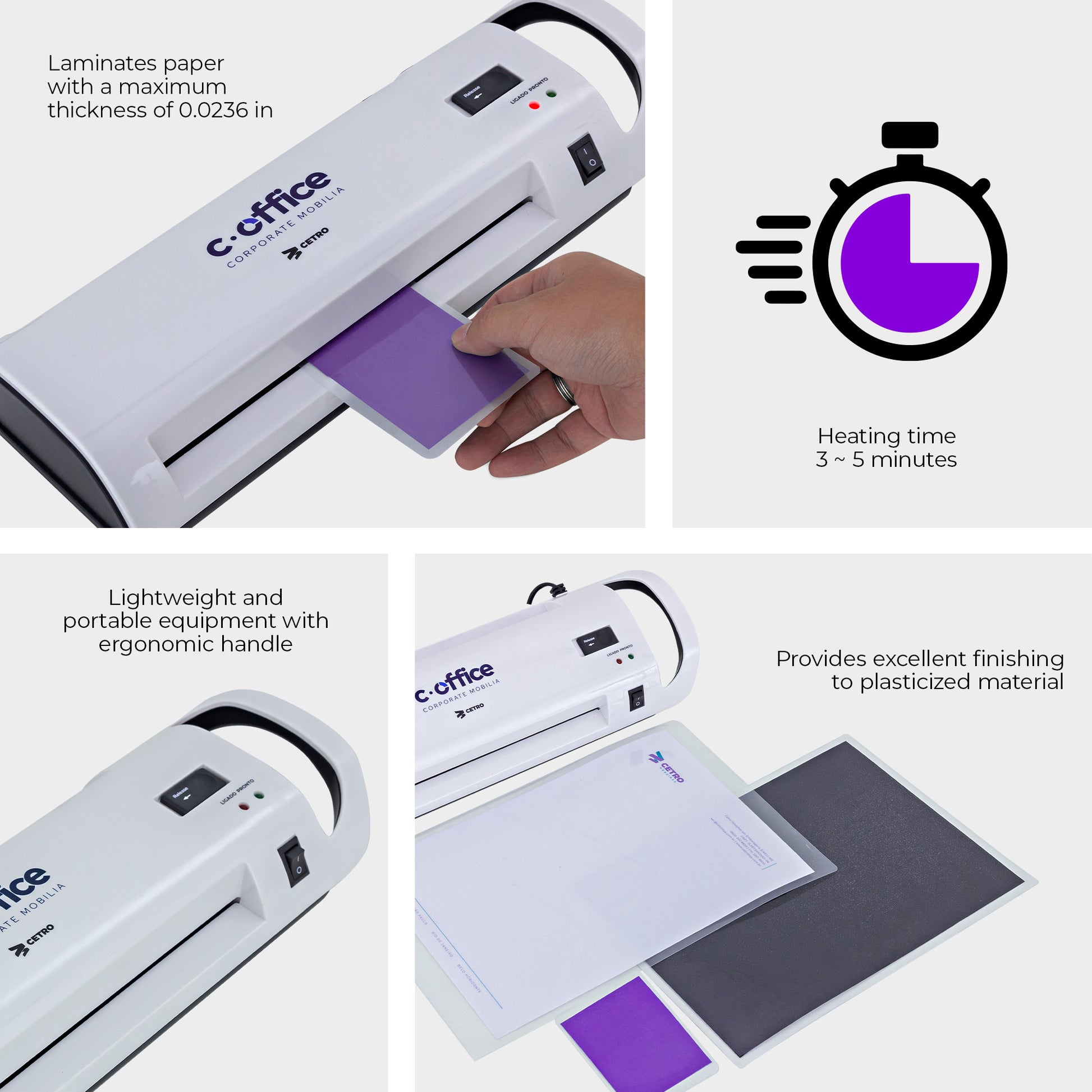 Cetro Office Laminating Machine COLM 220 A4 is ideal for laminating various printed materials, including restaurant menus, photos, documents, advertising material, certificates, badges, notices placed outside in the weather, posters, business cards, credentials, labels, password cards, etc. This equipment ensures perfect and uniform lamination in any material.