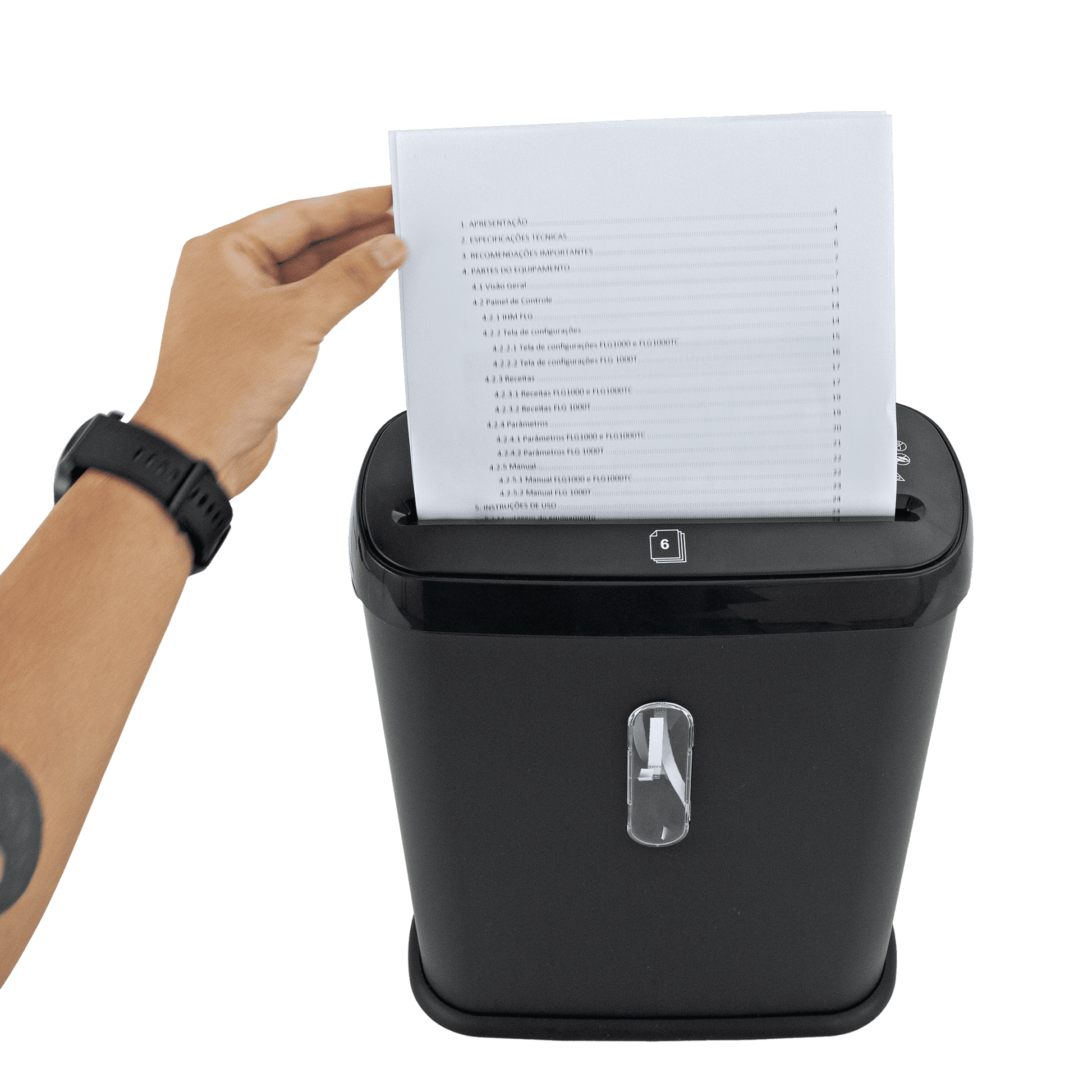The machine has a simple and functional panel with a paper entry. Its control switch has three main functions: start, stop, and reverse. The reverse function is useful for clearing the Shredding Machine from paper jams, making it easier to use and ensuring safety during operation.