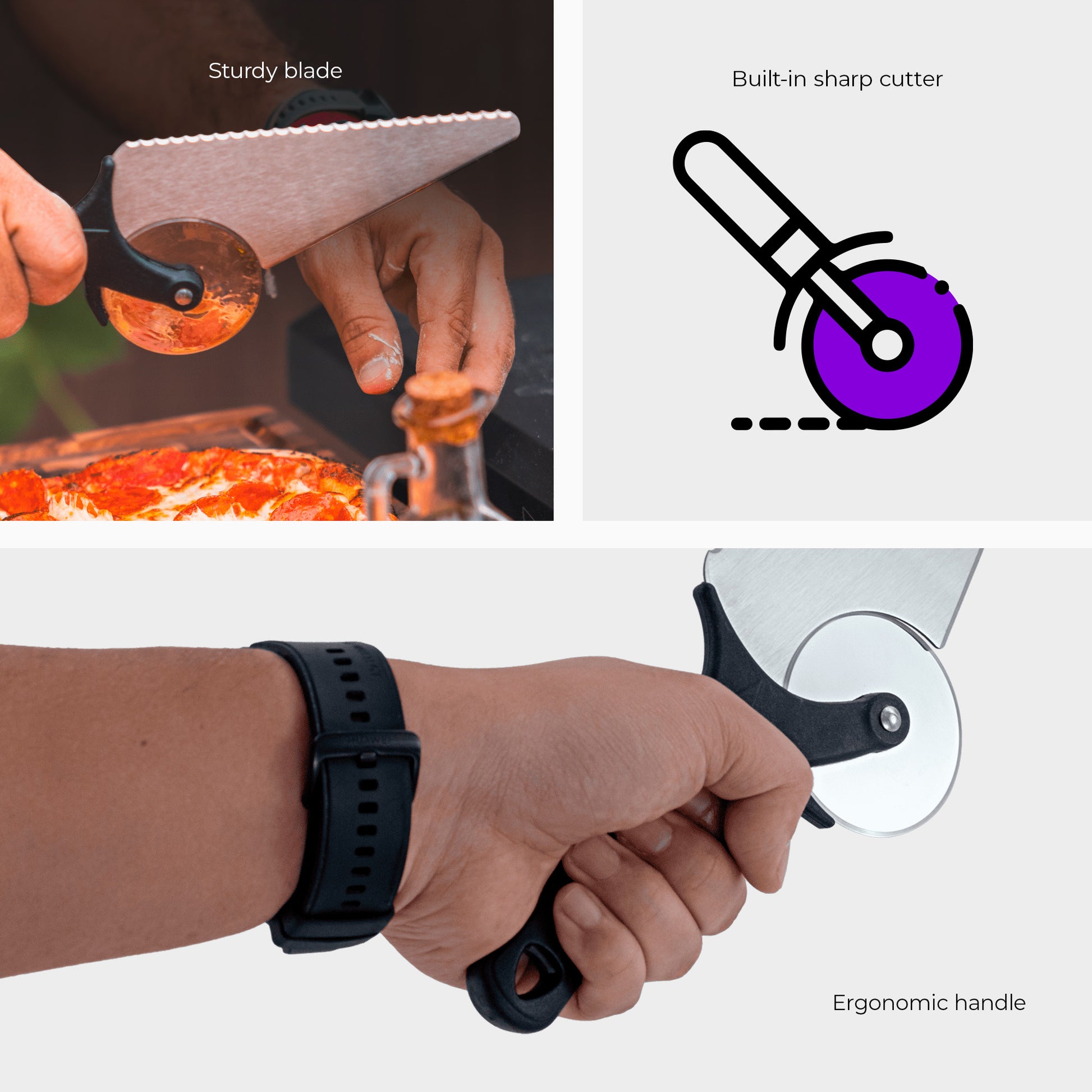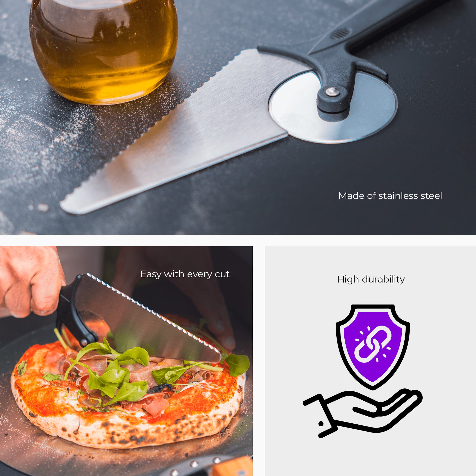 With a resistant blade and sharp cutter, this utensil provides a pizza preparation and serving experience that is as authentic as it is tasty. Sliding smoothly under the freshly baked pizza, it easily cuts different sizes of pizzas. It also has an ergonomic handle that makes it easy to serve each slice.