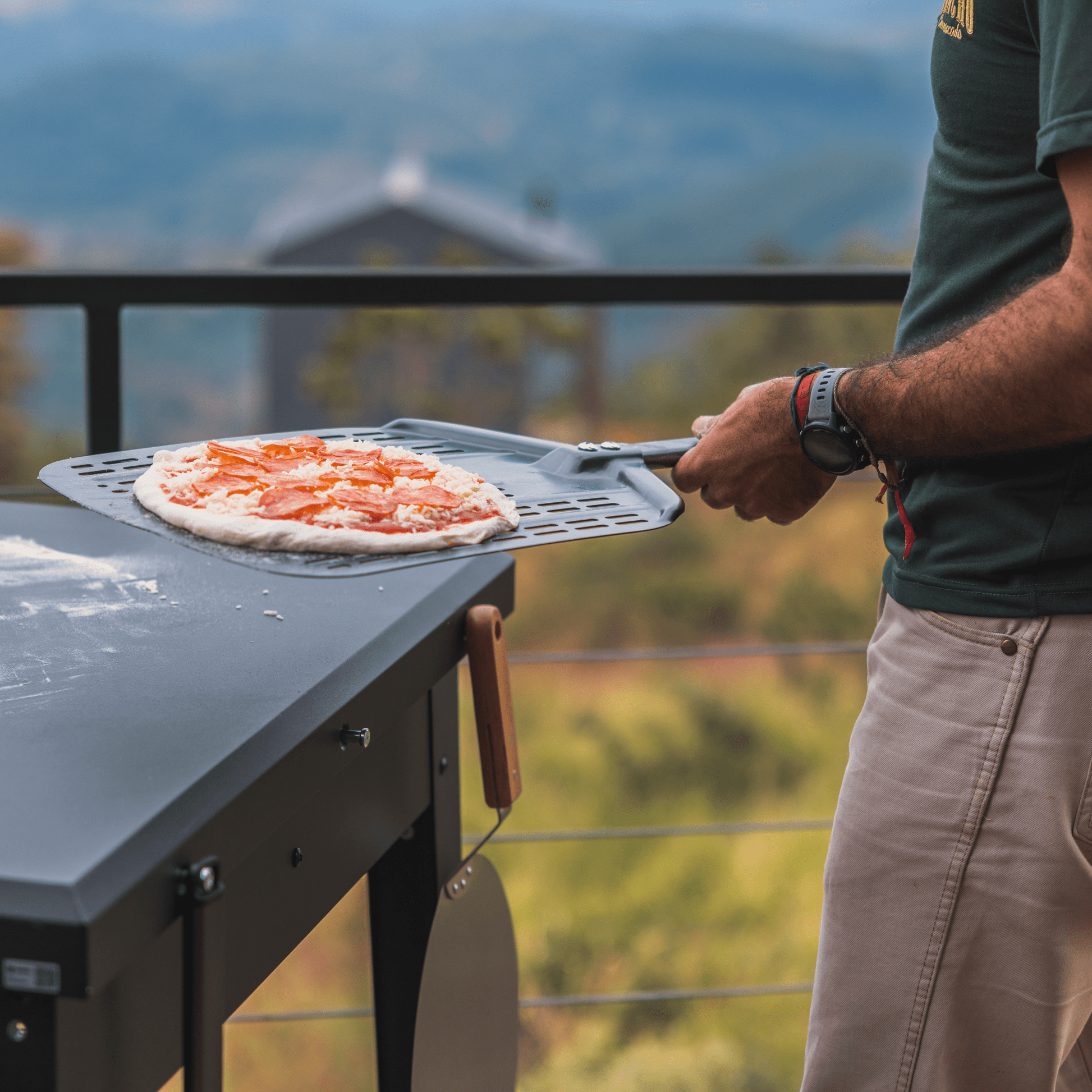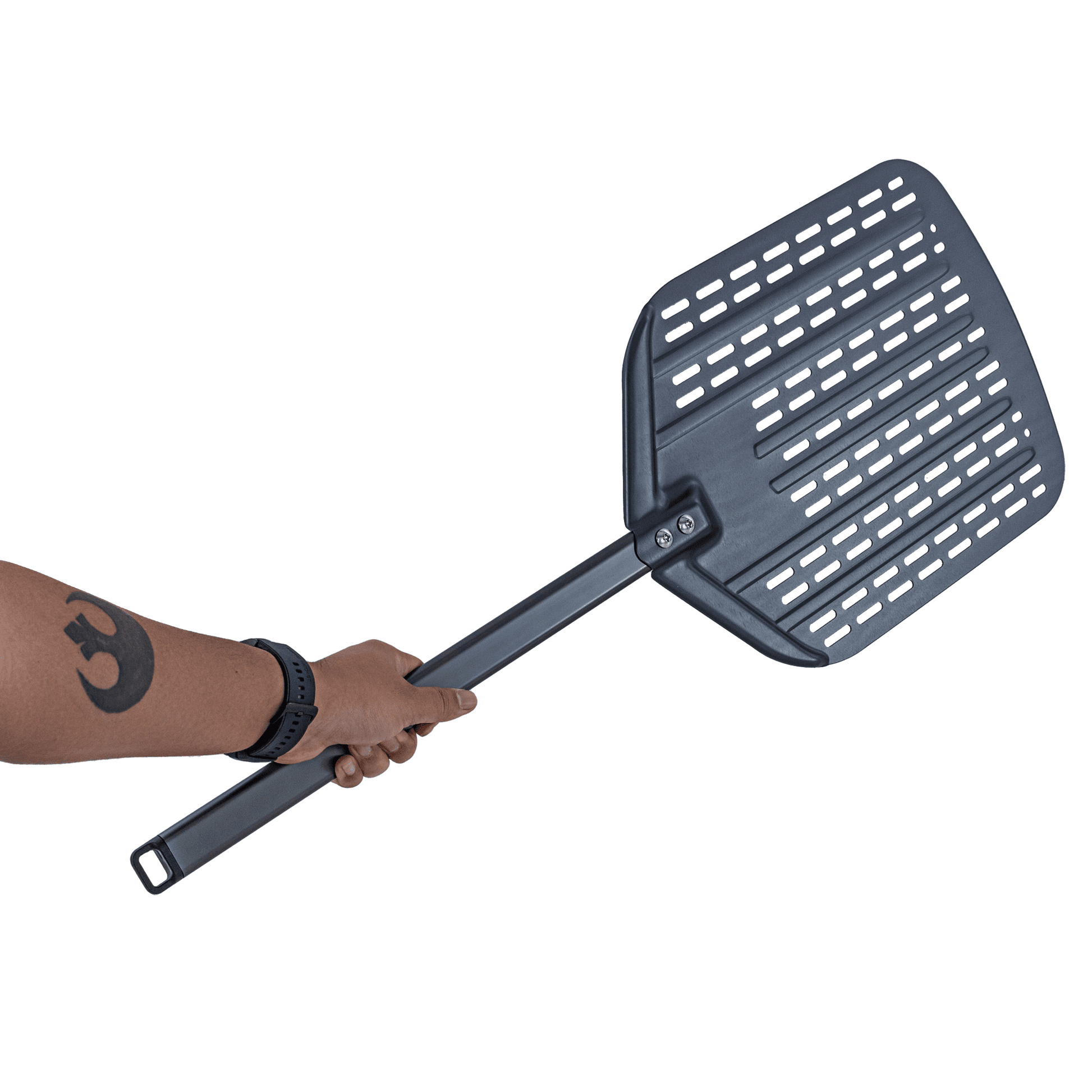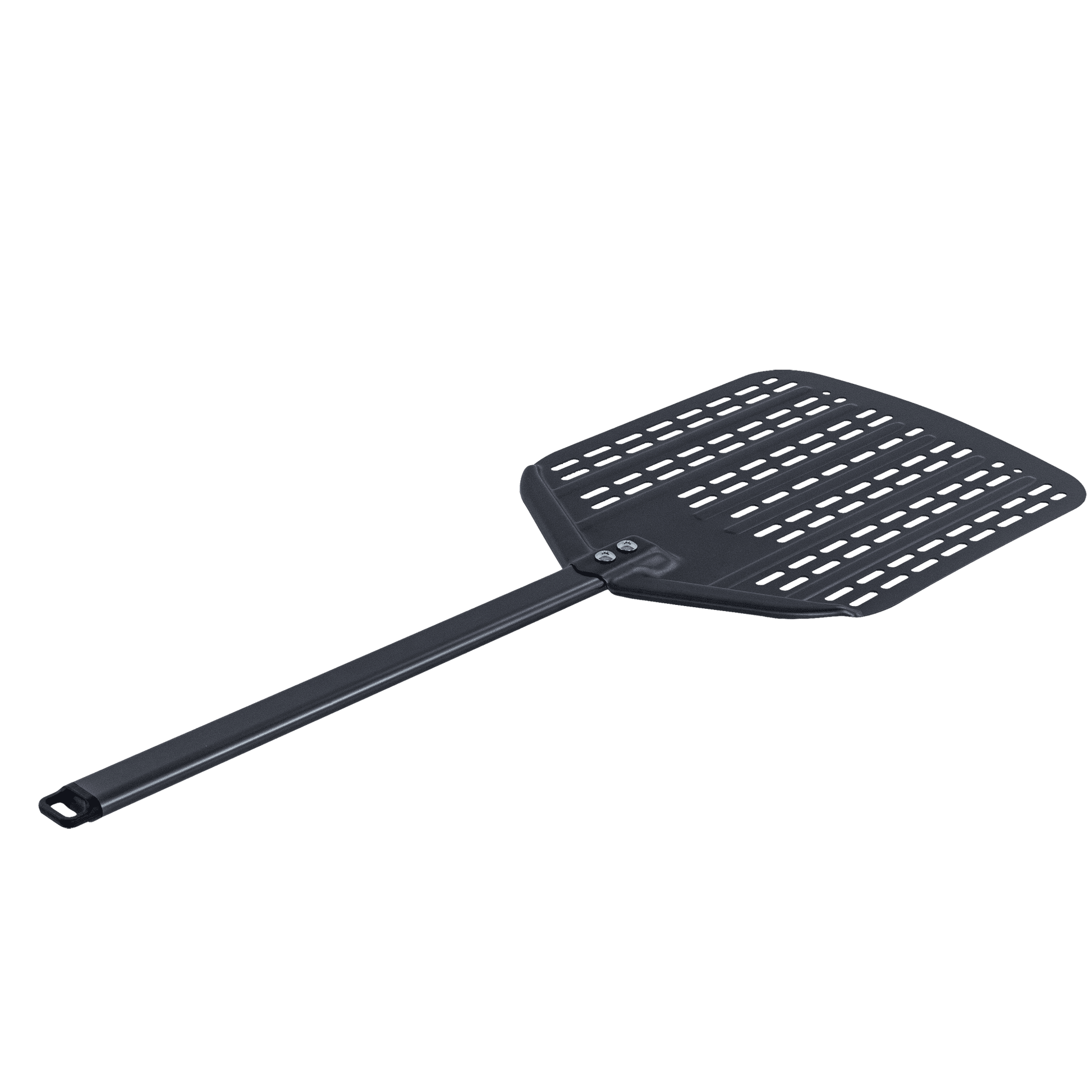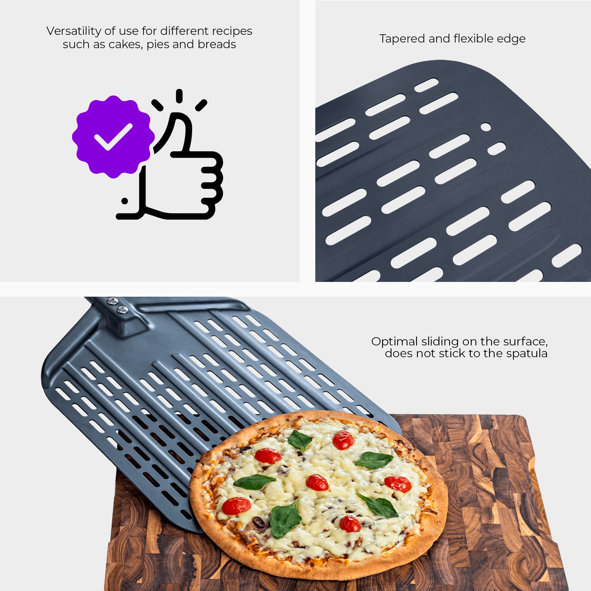 Cetro Pizza Turning Peel features a design that allows steam to escape during cooking, resulting in a crispy bottom crust and minimizing the adherence of burnt flour. Its structure reduces the surface area, making it easier for pizzas to slide in and out of the oven without sticking to the peel.