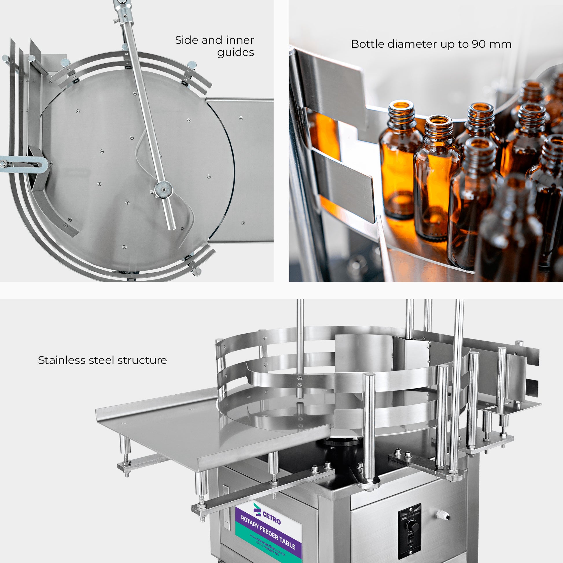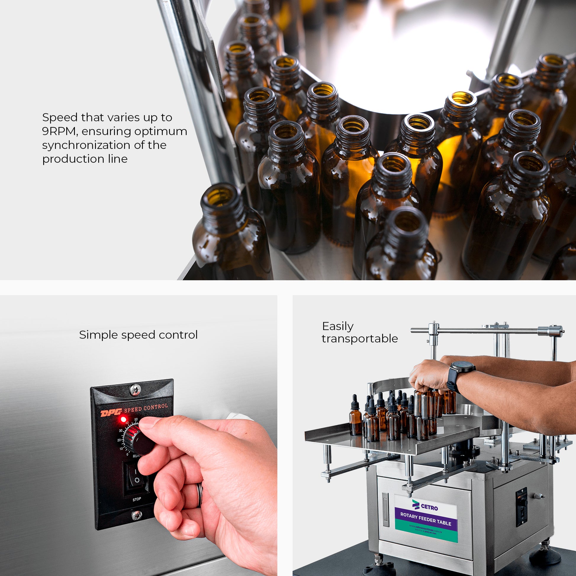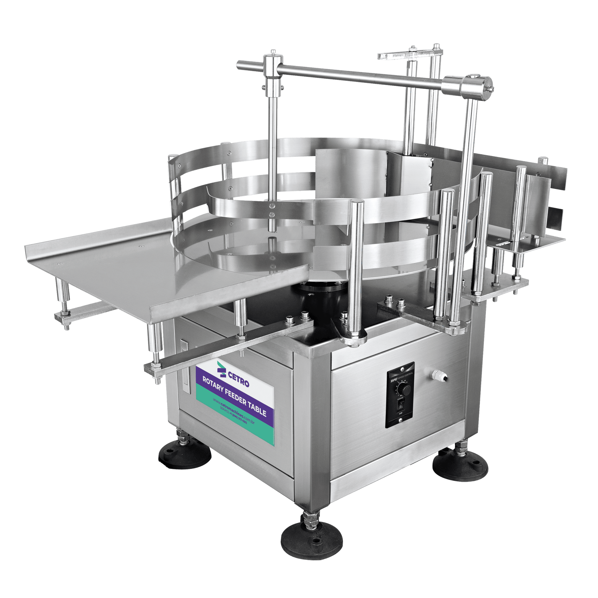 Cetro Rotary Table Machine Feeder CRT F-500 T was designed to work with other machines on a production line to facilitate and automate the filling process. It can be easily installed at any point on the production line, with customized measurements according to demand.