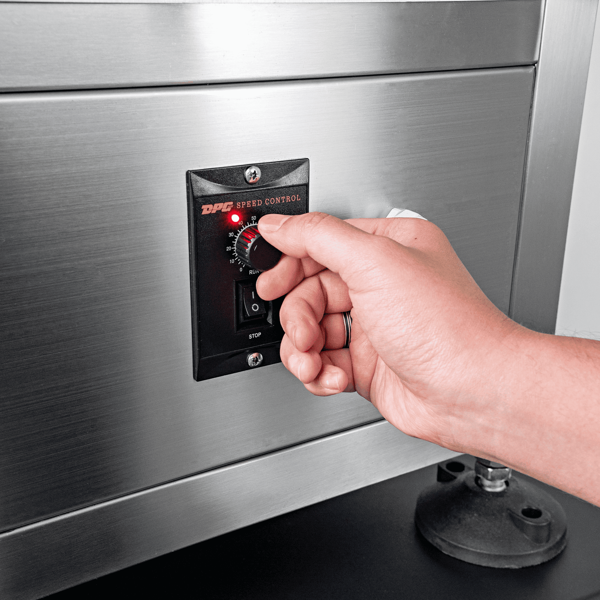 With speed settings of up to 9 RPM, this machine has intuitive speed adjustments. The operator must turn on the platform and turn the knob until the desired speed is reached.