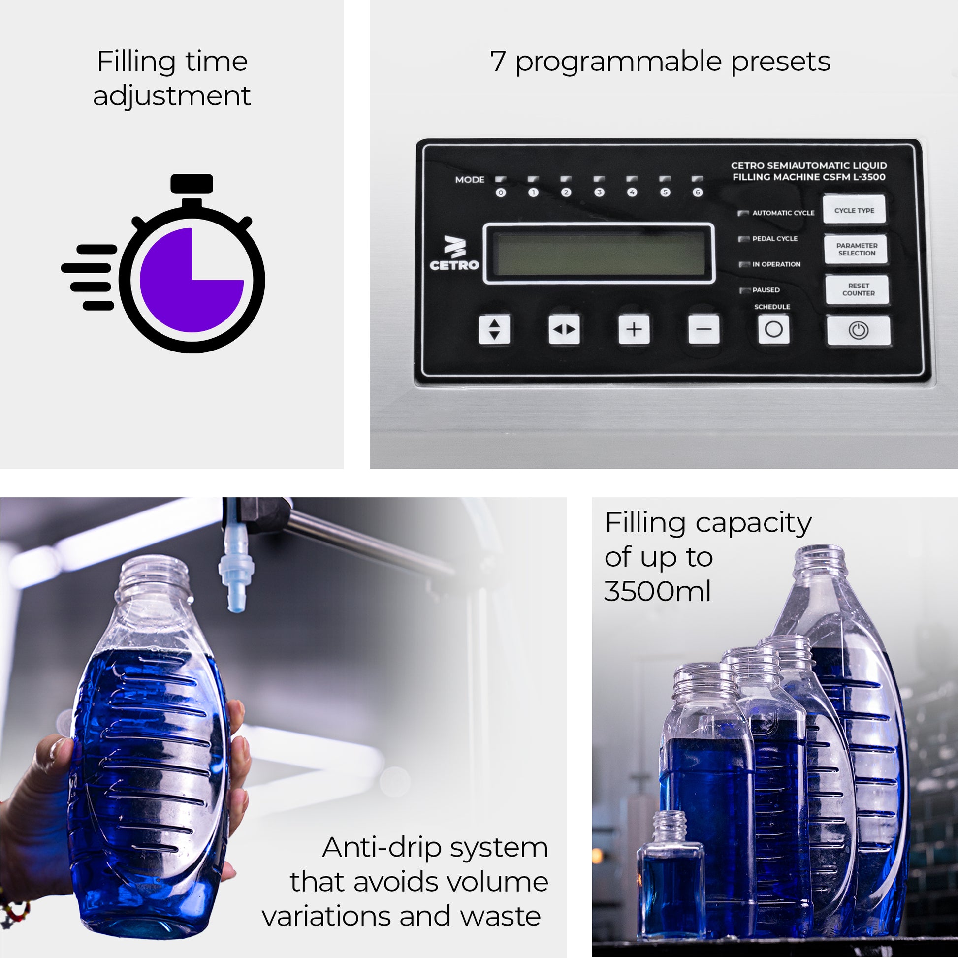 Cetro Semiautomatic Liquid Filling Machine CSFM L-3500 performs an accurate, fast, and efficient filling of medium and low-viscosity products.