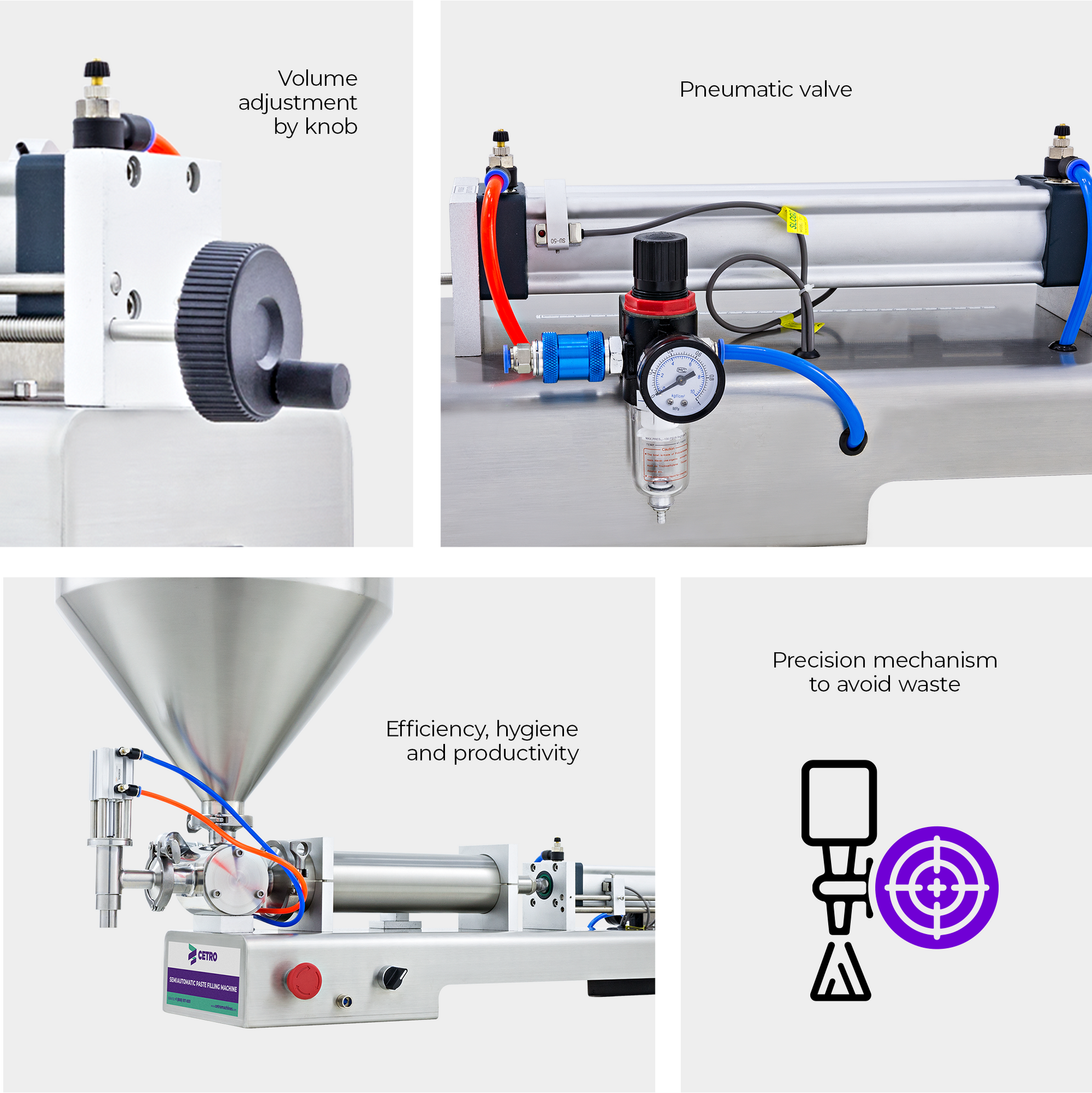 The Cetro Filling Machine is driven by a pneumatic system, so the piston does not come into contact with the product to be filled, ensuring a product free from contamination and damage caused by the external environment.