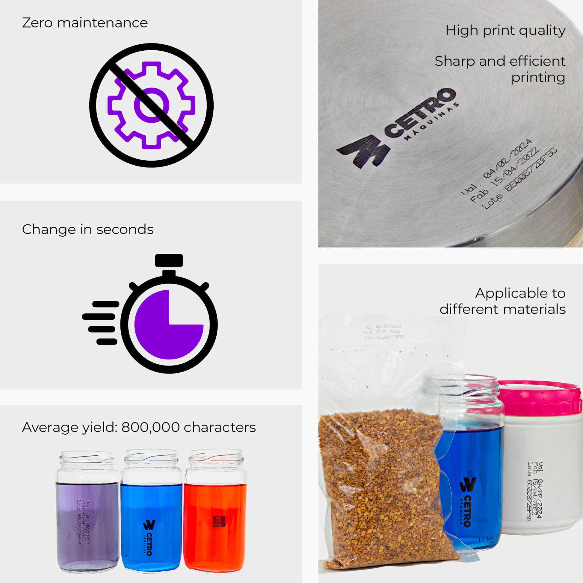 Cetro Solvent-based Inkjet Cartridge exchange is done in a few seconds, guaranteeing the flow of your productivity. In addition, there is no need for specialized technical assistance, neither for replacement nor for routine maintenance of the equipment, since the cartridge itself is the equipment's printhead.