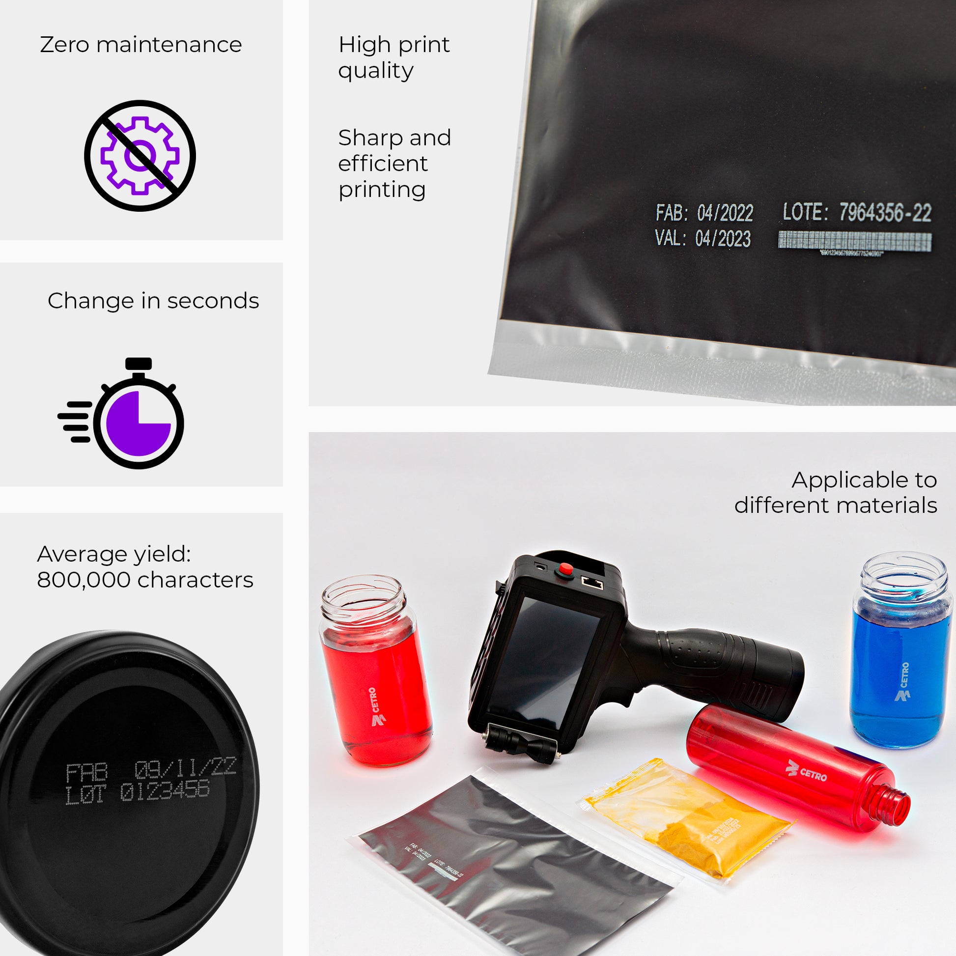 Cetro Solvent-based Inkjet Cartridge exchange is done in a few seconds, guaranteeing the flow of your productivity. In addition, there is no need for specialized technical assistance, neither for replacement nor for routine maintenance of the equipment, since the cartridge itself is the equipment's printhead.