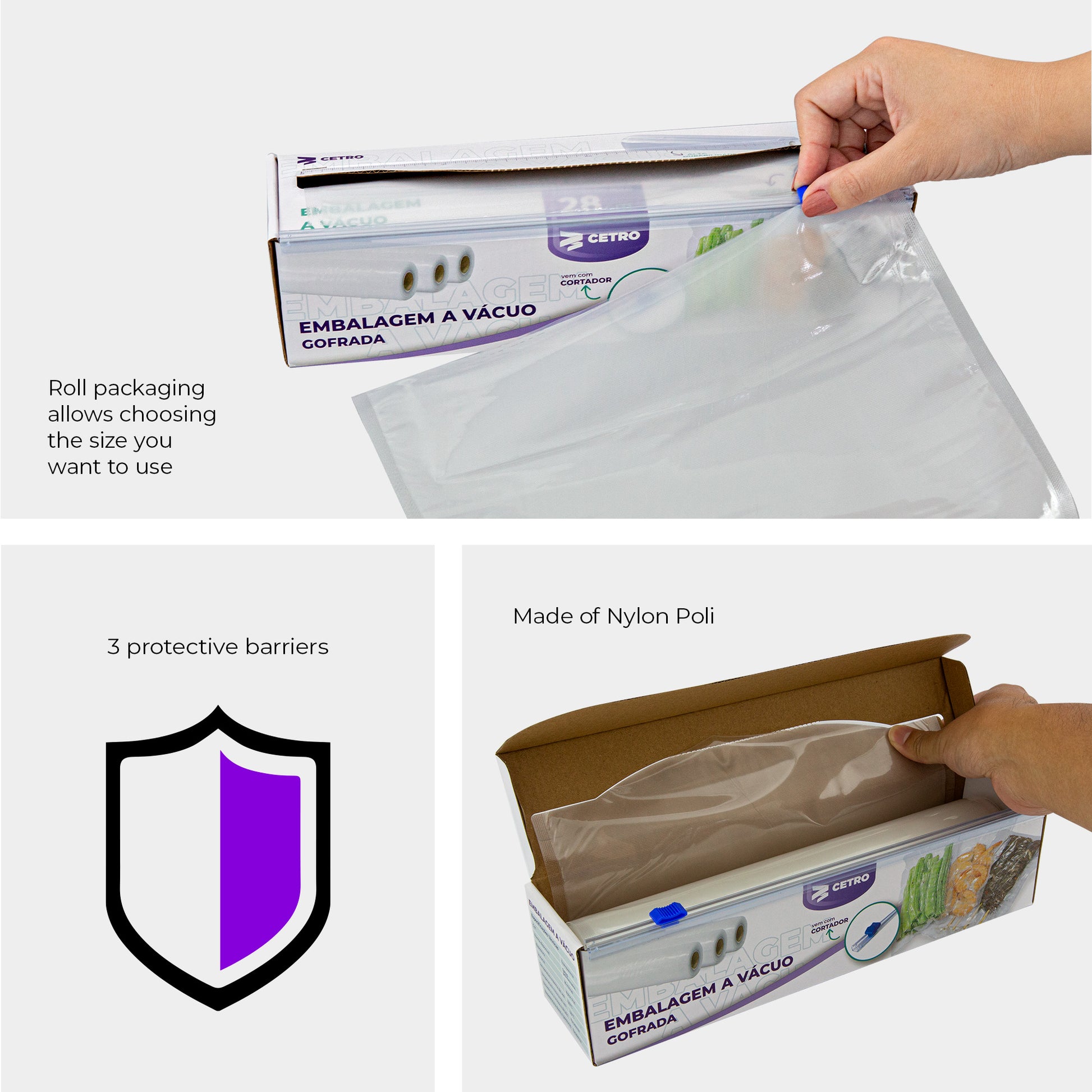 Cetro Structured Vacuum Seal Roll is produced with high technology in Nylon Poly and Bisphenol A free, high resistance, following international quality standards. They have 27 microns and 3 protection barriers, in addition to being adaptable to any Vacuum Sealer for structured bags.