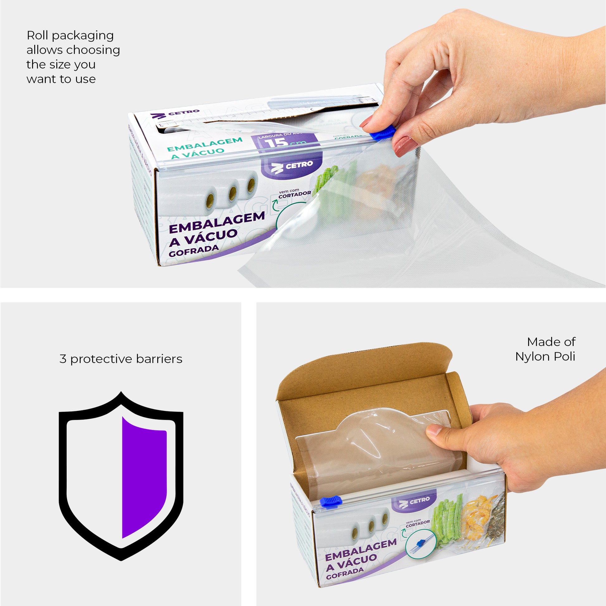 Cetro Structured Vacuum Seal Roll is produced with high technology in Nylon Poly and Bisphenol A free, high resistance, following international quality standards. They have 27 microns and 3 protection barriers, in addition to being adaptable to any Vacuum Sealer for structured bags.
