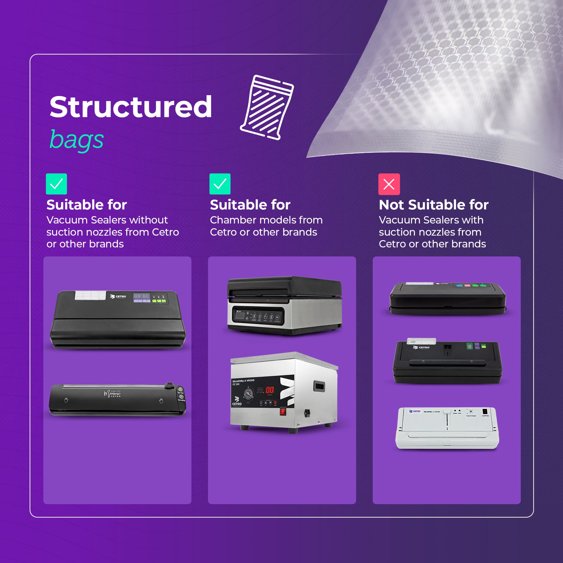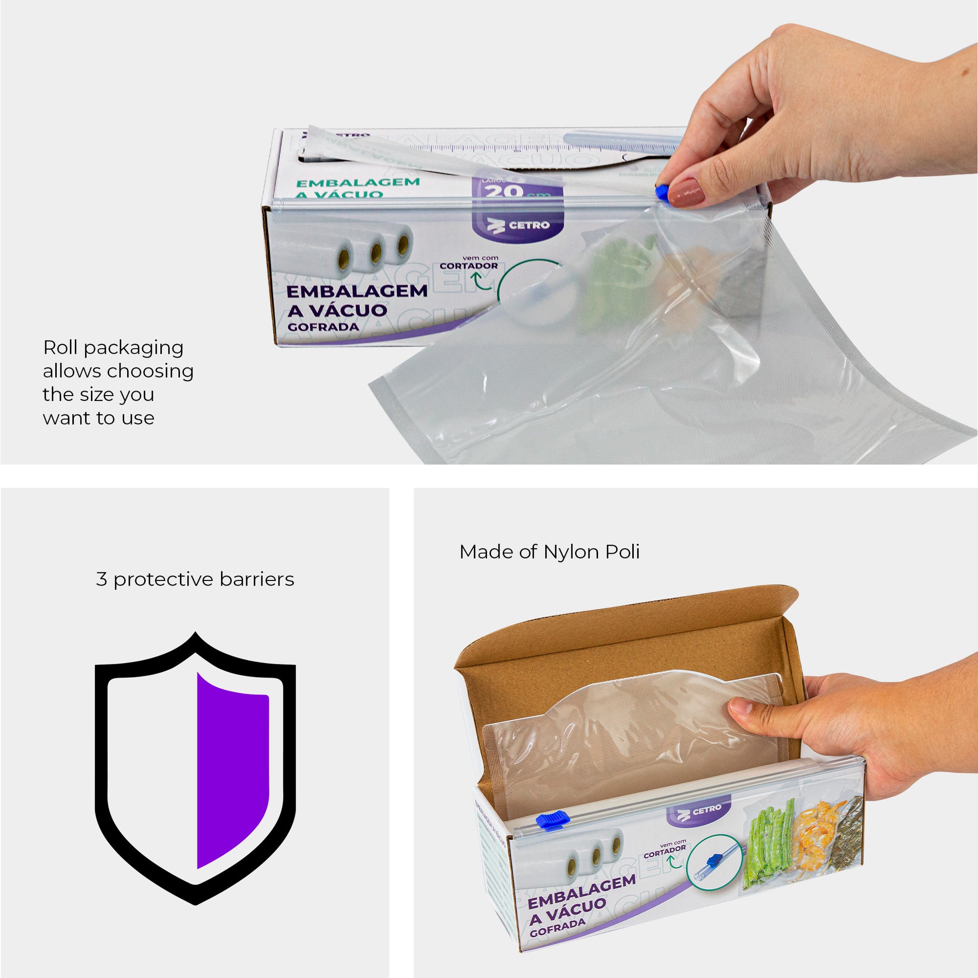 Cetro Structured Vacuum Seal Roll is produced with high technology in Nylon Poly and Bisphenol A free, high resistance, following international quality standards. They have 27 microns and 3 protection barriers, in addition to being adaptable to any Vacuum Sealer for structured bags.