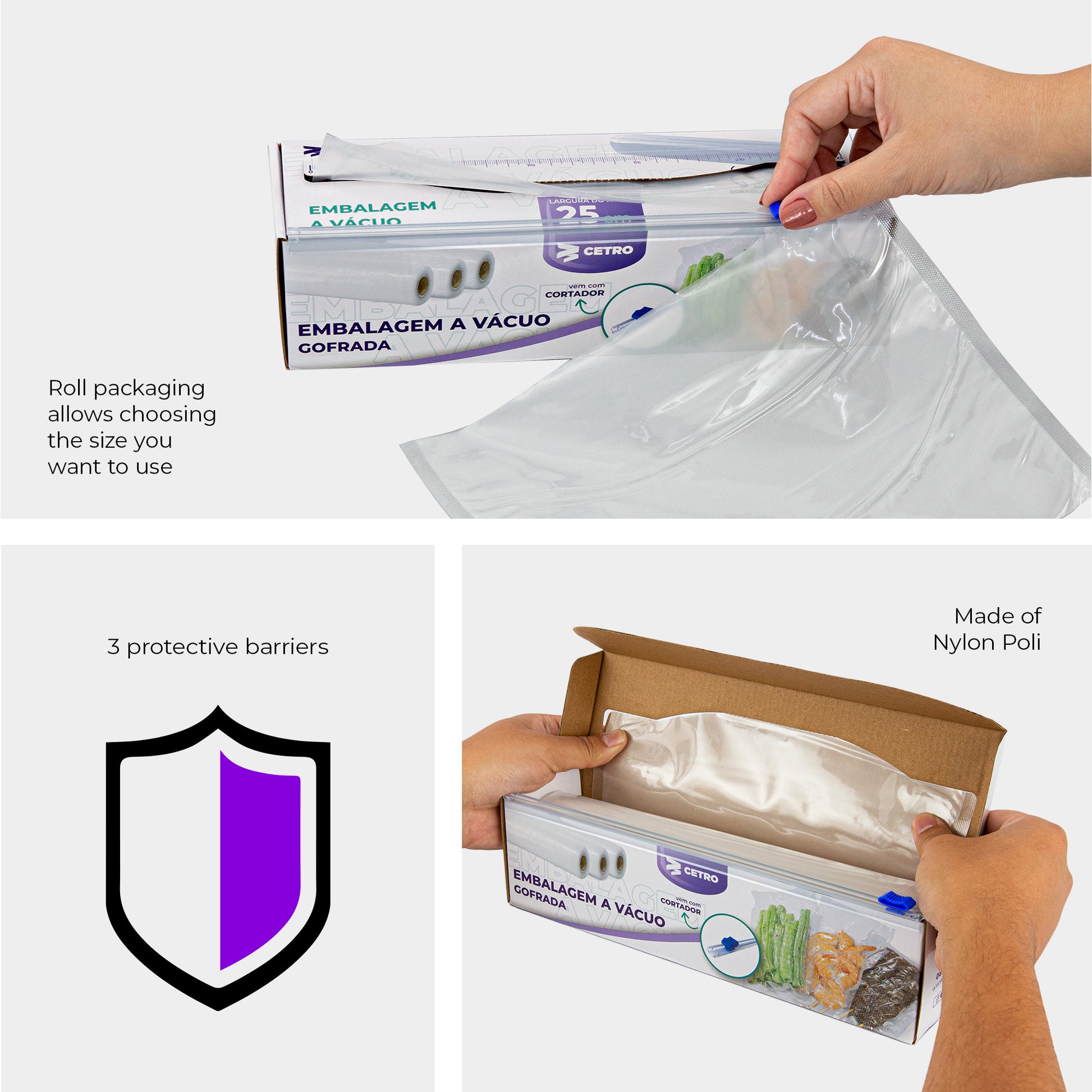 Cetro Structured Vacuum Seal Roll is produced with high technology in Nylon Poly and Bisphenol A free, high resistance, following international quality standards. They have 27 microns and 3 protection barriers, in addition to being adaptable to any Vacuum Sealer for structured bags.