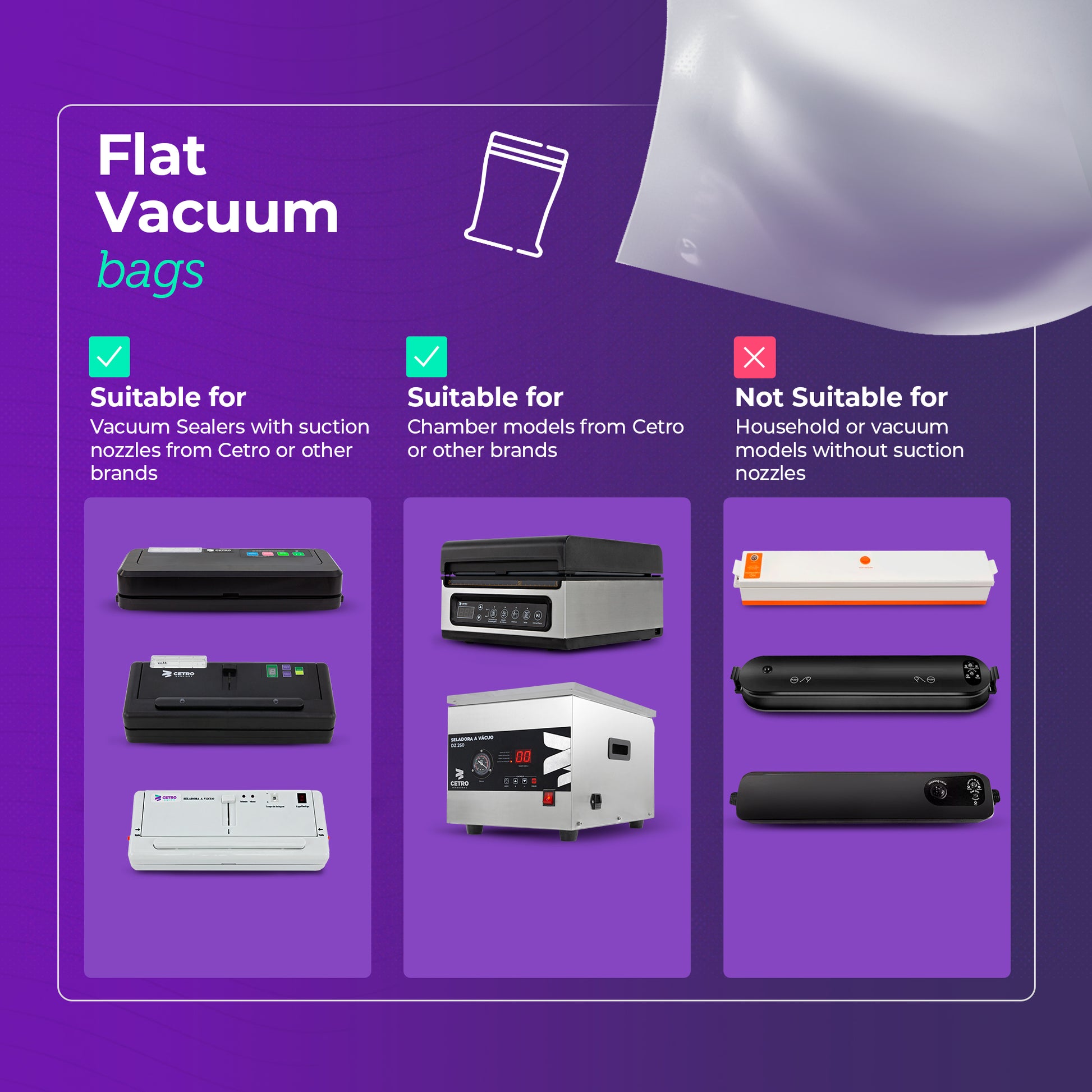 This model can be used with any Cetro Vacuum Sealer compatible with flat vacuum bags (without grooves). For use with machines of other brands, check compatibility.