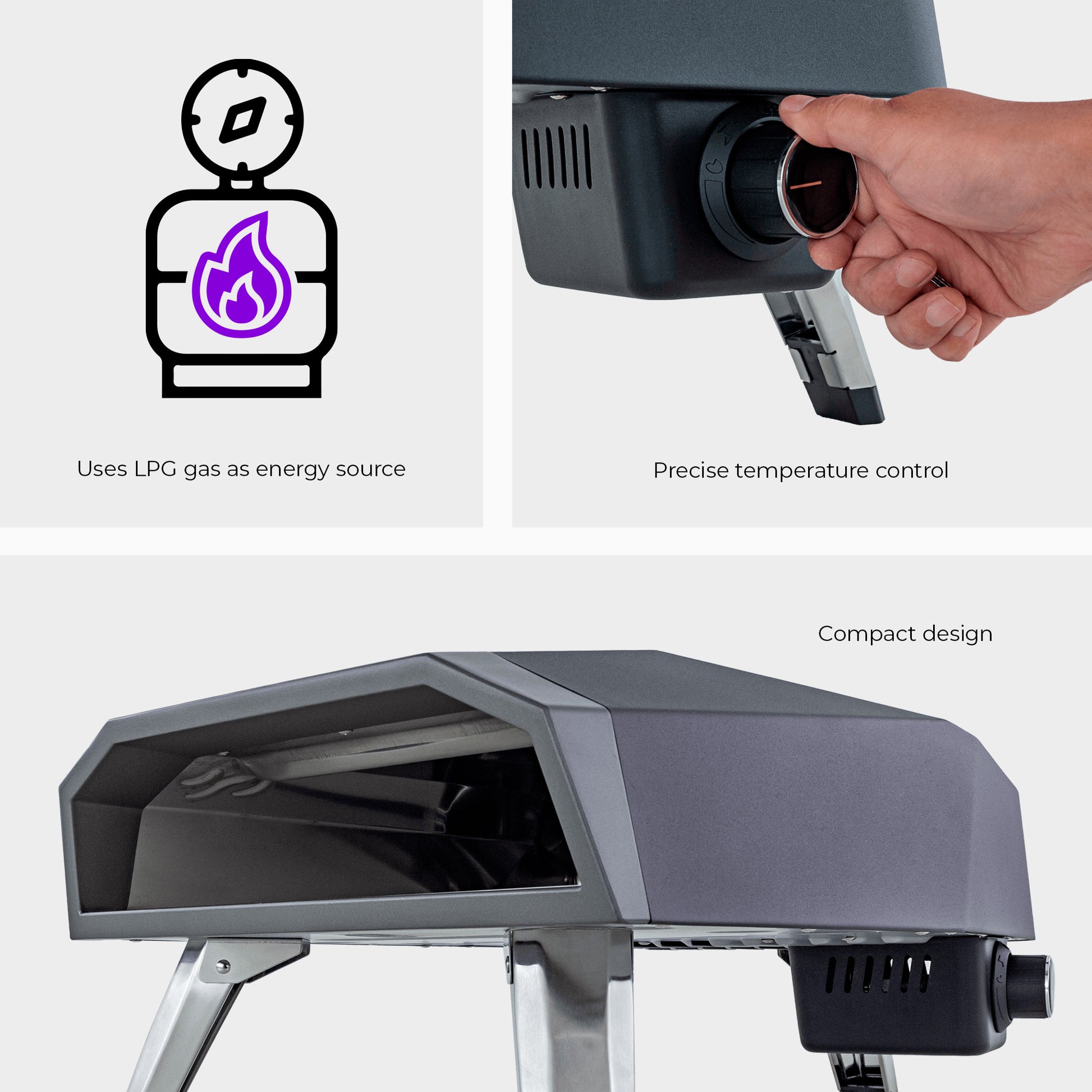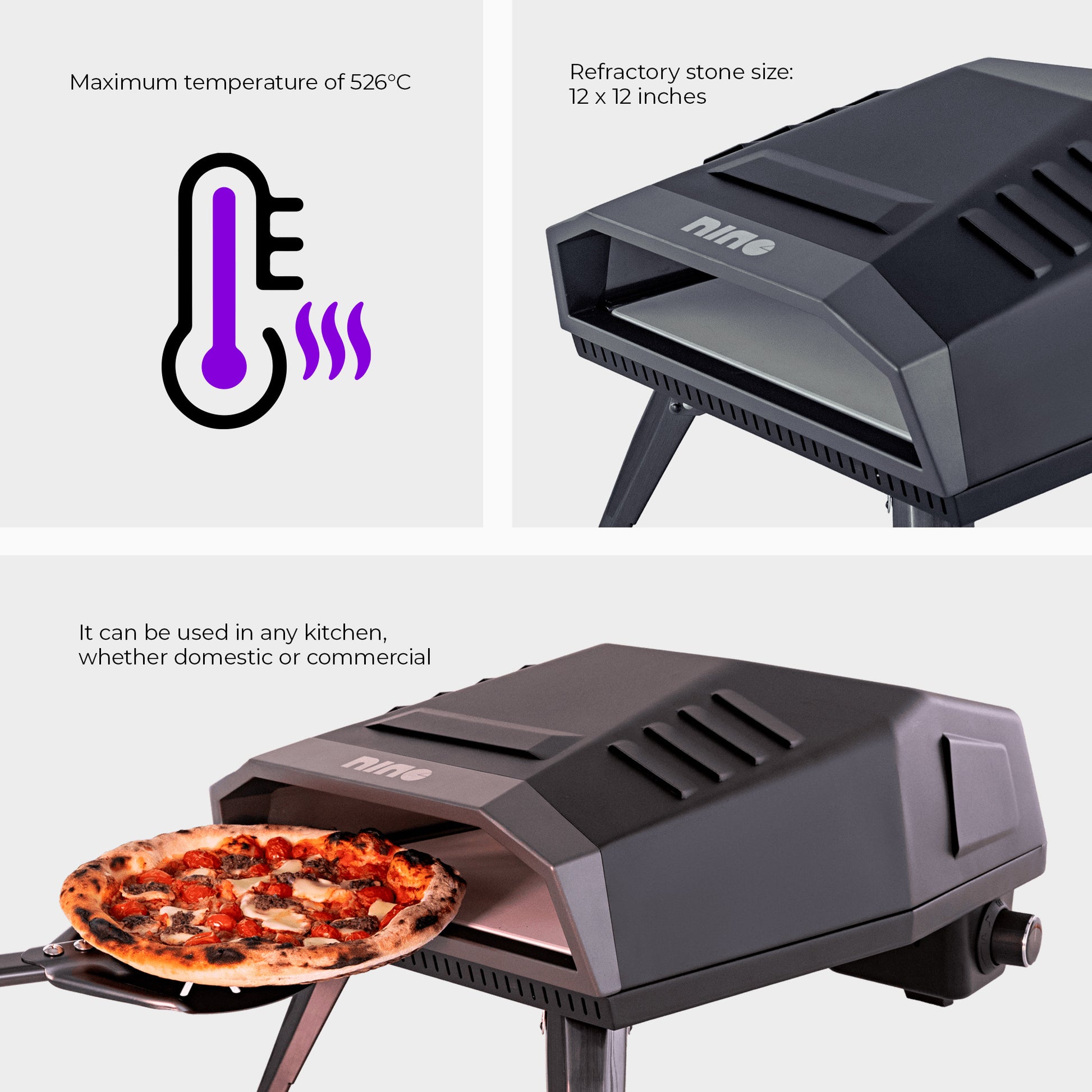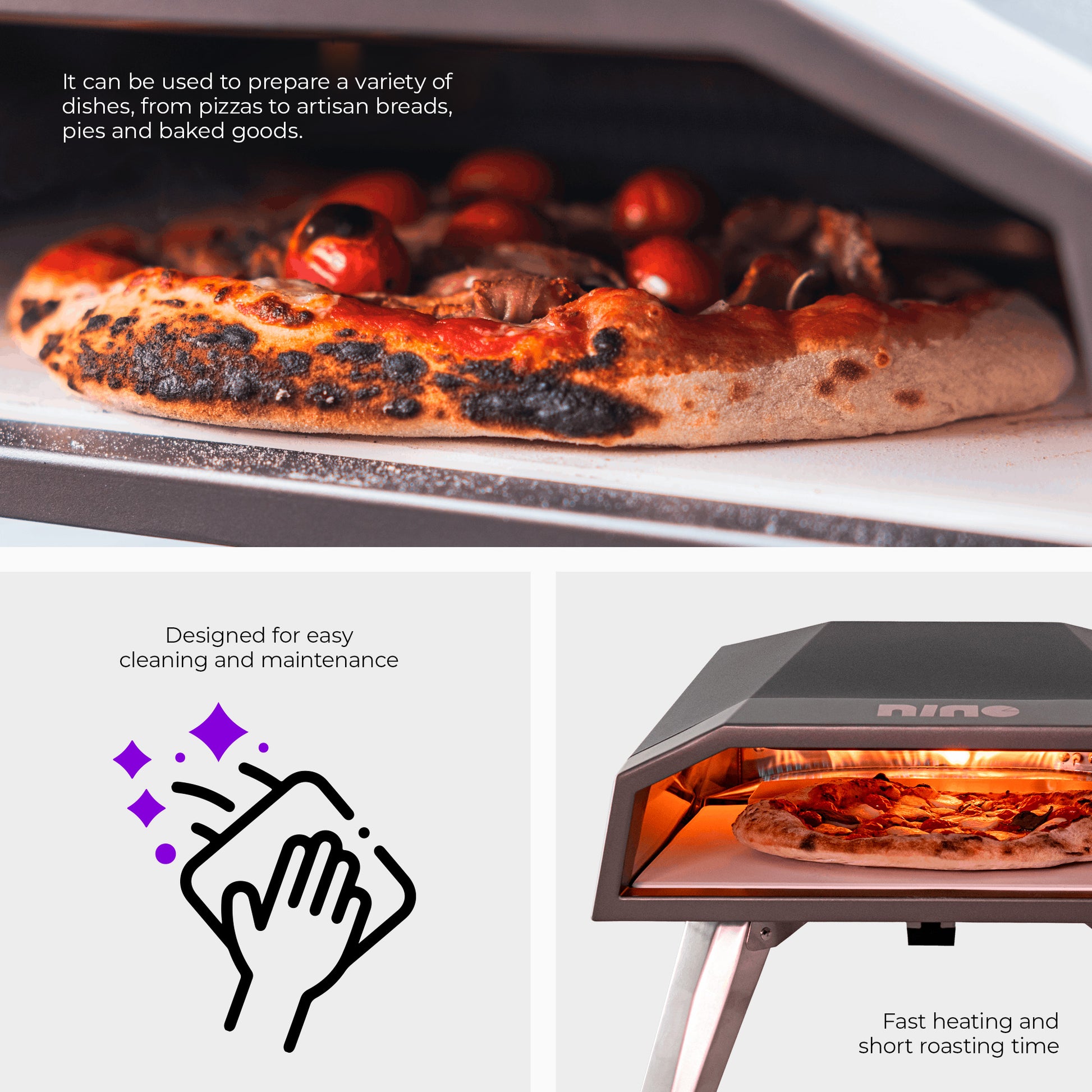 With retractable feet, you can easily transport your Nino Oven and use it in your leisure area or inside your kitchen. Despite its small size, this oven is extremely efficient, ensuring fast and consistent cooking.
